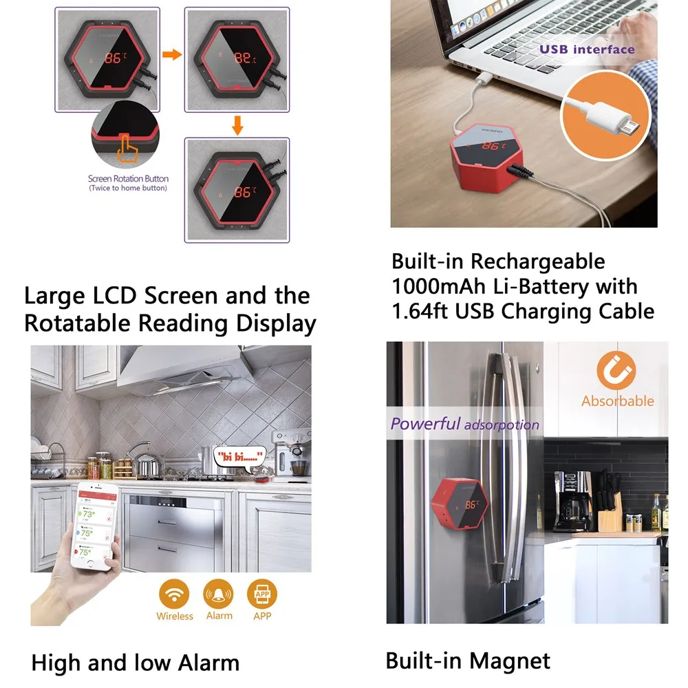 3.Магнитный дизайн и поворотный экран:Магнитная конструкция на задней части устройства может быть адсорбирована на курильщика или печи и т. Д. Сильно. BTW, дважды нажмите кнопку питания, чтобы вы могли считывать показания вращения вверх и вниз. Примечание: Пожалуйста, не помещайте устройство в местах с высокой температурой. Температура пластикового блока не должна превышать 80 ℃/176F.