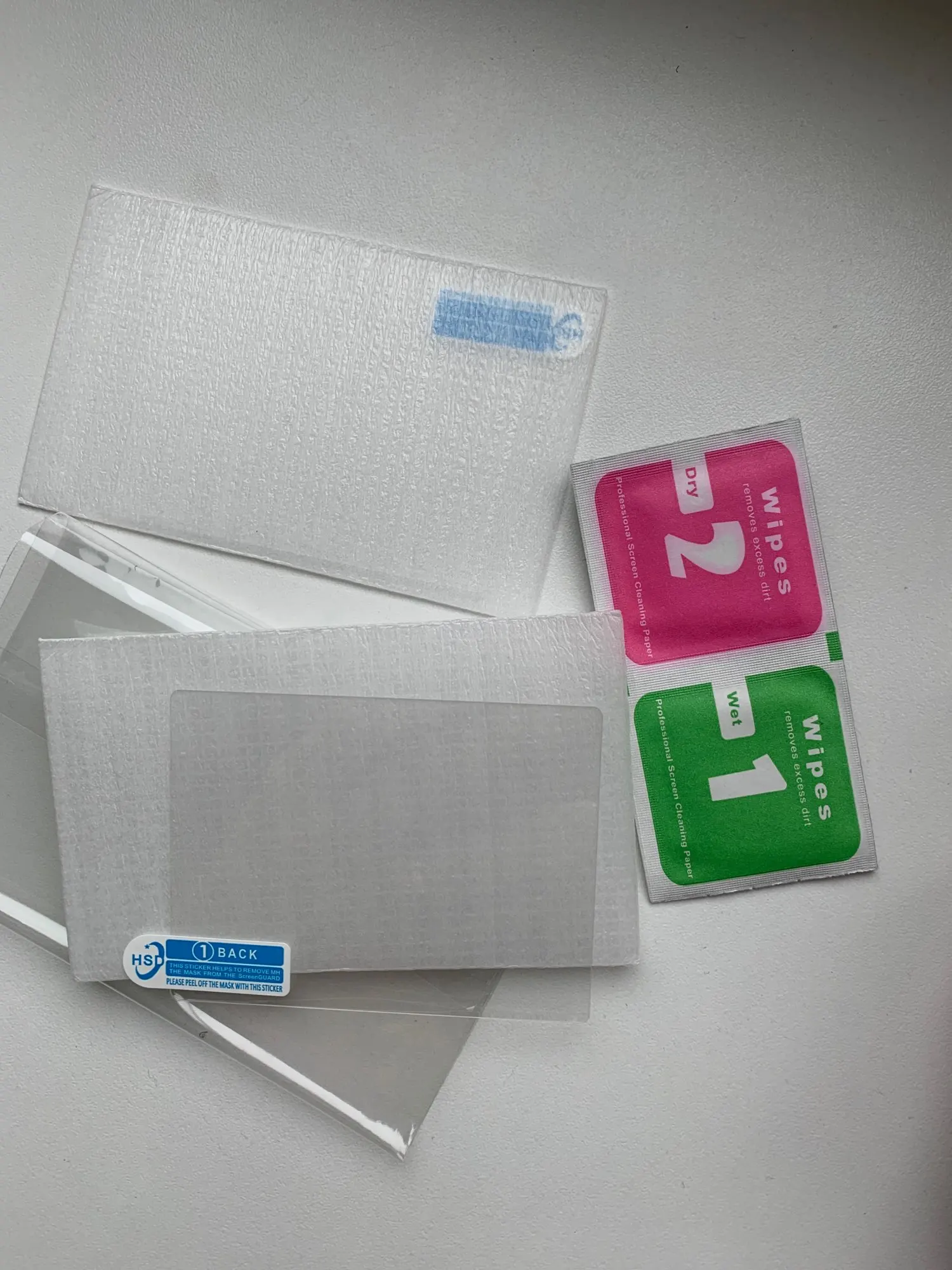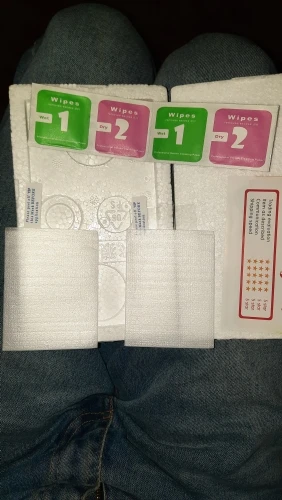 в комплекте 2 стекла и 2 комплекта салфеток. упаковано в пенопластовую коробку. из минусов - салфетки фигня, одна высохшая, старая, а вторая толком не оттирает)) а сухие салфетки в итоге оставляют разводы. хорошо что у каждого фотографа есть нормальные средства для очистки и салфетки. размер стекла почти подходит, норм. в комплекте нет клейких бумажек, которыми можно было бы отцентрировать стекло перед накладыванием.