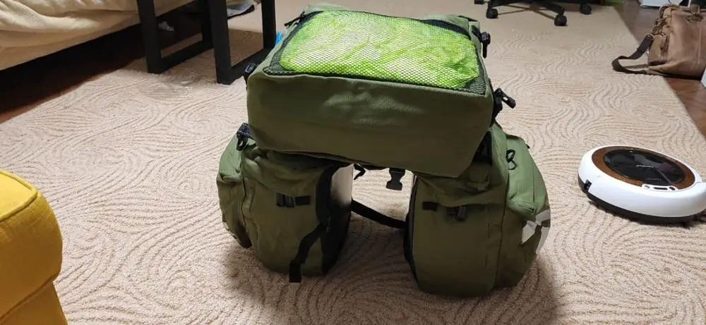 сумки оказались чуть меньше чем я себе придумал в голове, но порадовала плотная подложка на внутренней стороне, сумки держат форму, на собачки рекомендую заранее заказать петли как на зимних куртках, для более удобного застегивания-расстегивания, штаны в сложенном состоянии вмещаются в верхнюю сумку, что очень удобно когда нужно переносить сумки не на багажнике, в комплекте есть ремень для переноски, но по мне он чутка коротковат.