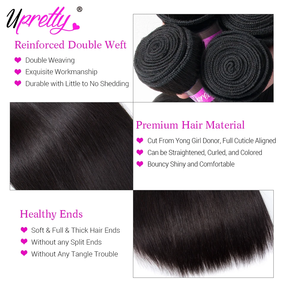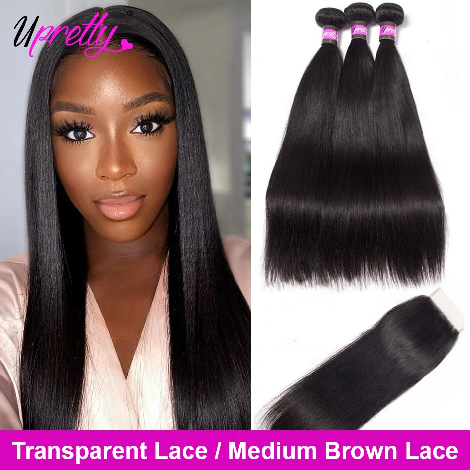 Upretty бразильские Прямые пряди с закрытием HD прозрачное кружевное закрытие с пряди человеческих волос Плетение 3 пряди с закрытием