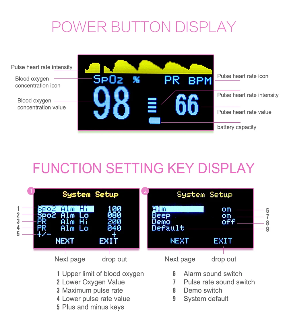 2) дисплей SpO2 и частоты пульса, дисплей штрих-графа