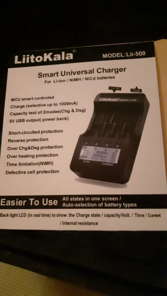 Все в порядке. Прекрасно выполняет свою обязанность. Сенсорные кнопки очень удобные и не собирают пыль. Надеюсь, что это длится с течением времени зарядное устройство. Функции разрядки, зарядки и tedt. Как я могу узнать, что Марка LitoKala входит в число лучших в отрасли. Рекомендуется это зарядное устройство Lii-500 S, потому что среди других моделей есть функция разряда, которую sltri не имеет. Рейтинг 10