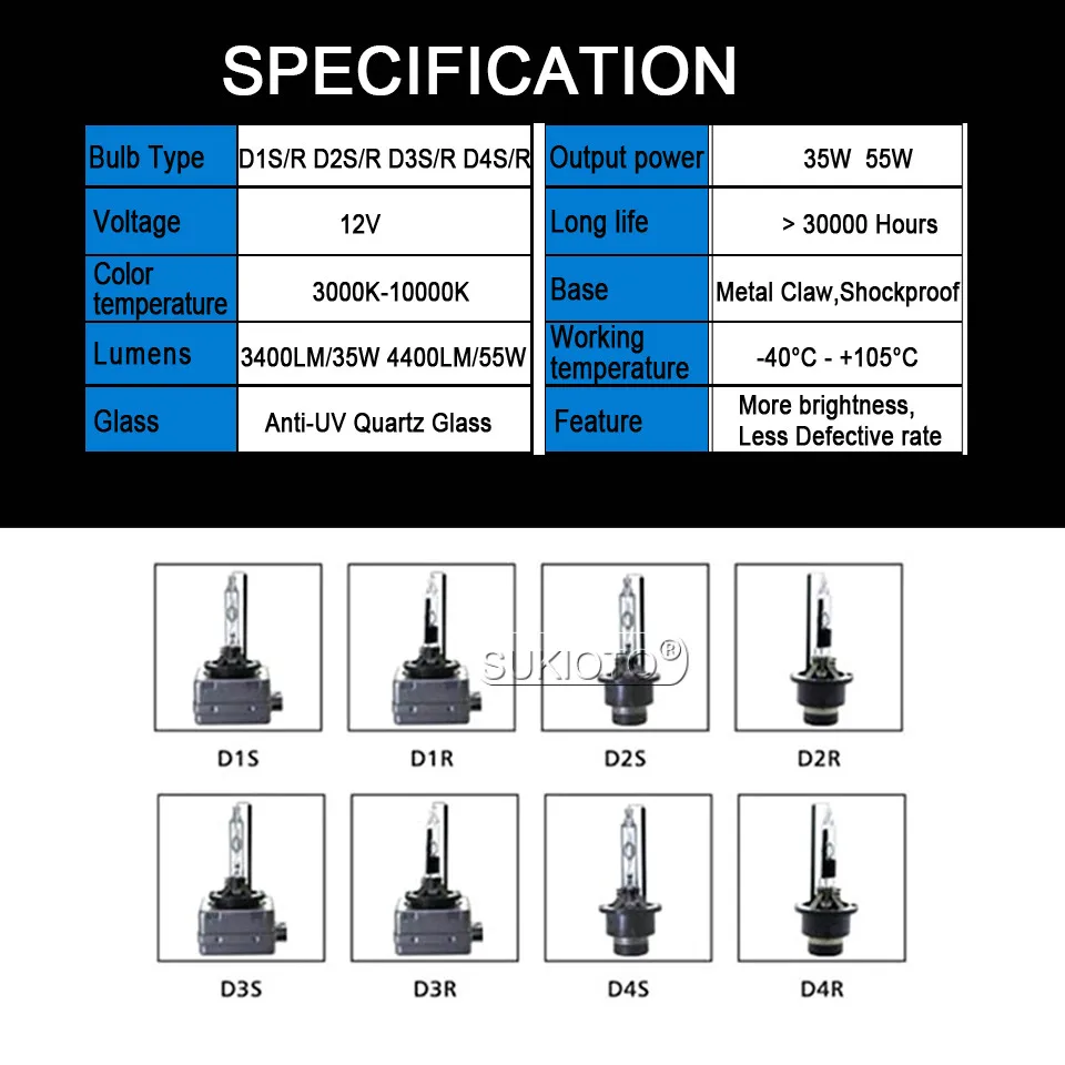 SUKIOTO 55W HID ксеноновые лампы d1s 5000k d4s 4300K d2s 55w 12V 6000k 8000K Автомобильная ксеноновая лампа 10000K металлическая лапка hid лампы для фарБренд: SUKIOTOПосылка: 1 пара ламп HID + 1 подарочная коробкаМощность:35 Вт = Выберите 3400LM55 Вт = Выберите> 4000LMСтиль: ACЦветовая температура: 4300K (белый желтый) 5000K (теплый белый) 6000K (холодный белый) 8000K (белый синий) 10000K (кристально-синий)Модель лампы: D1S D1R D2S D2R D3S D3R D4S D4RГарантия: 12 месяцевПримечание: товары должны работать вместе с балластами или проводами!