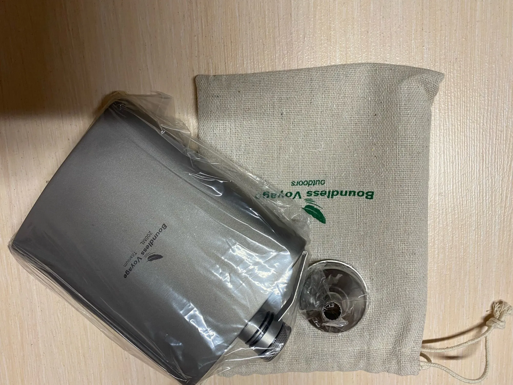 очень лёгкая. сама фляга и элементы конструкции не проминаются и не гнутся. крышка заркучивается с неприятным металлическим скрежетом, но это ожидаемо. в крышке есть силиконовая прокладка. фляга хорошо упакована в коробочку из плотного картона, сама лежит в холщовом мешочке на стяжках. в комплекте идёт воронка