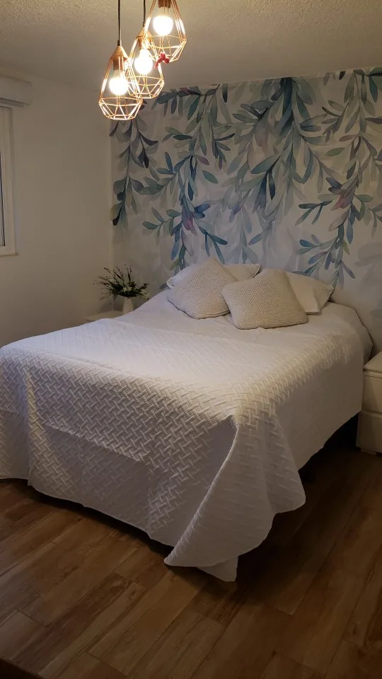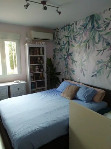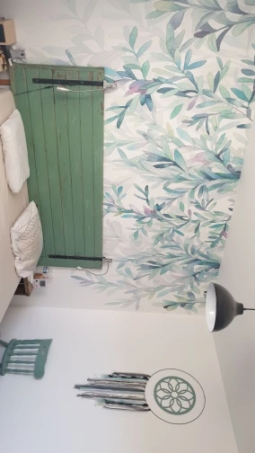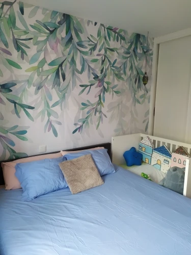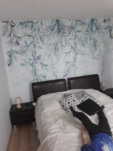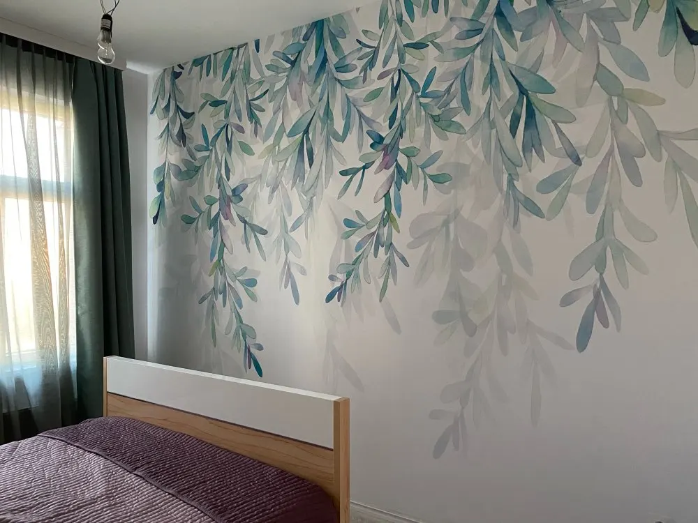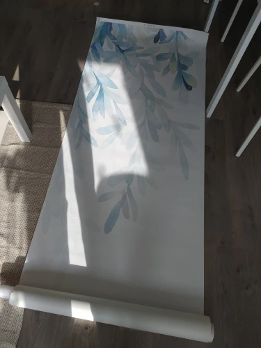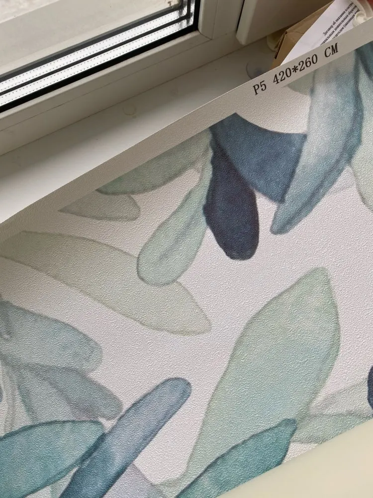Не успела заказать текстуру нужную. по умолчанию водонепроницаемый холст,качество,как клеёнка,очень прочные. но для спальни такой материал не нужен. поэтому указывайте продавцу в сообщении какая текстура нужна,продавец спросил,а я поздно увидела сообщение.смотрятся красиво. заказывала ширину 4 м,но по факту пришло больше где-то на 60 см. и это не всегда плюс,так как кому то может нужно в размер,чтобы не срезать рисунок. не удобно то, что стык нужно резать,то есть нужно длинную линейку. у меня клеили профмаляры поэтому проблем не было. мужу не очень нравится размытый рисунок,мне нормально,так как эффект акварели. есть ещё подушки с таким рисунком на АлиЭкспресс. основные стены лучше делать белыми,я сделала голубыми и жалею,но с белыми шторами,шкафом и дверью будет нормально.