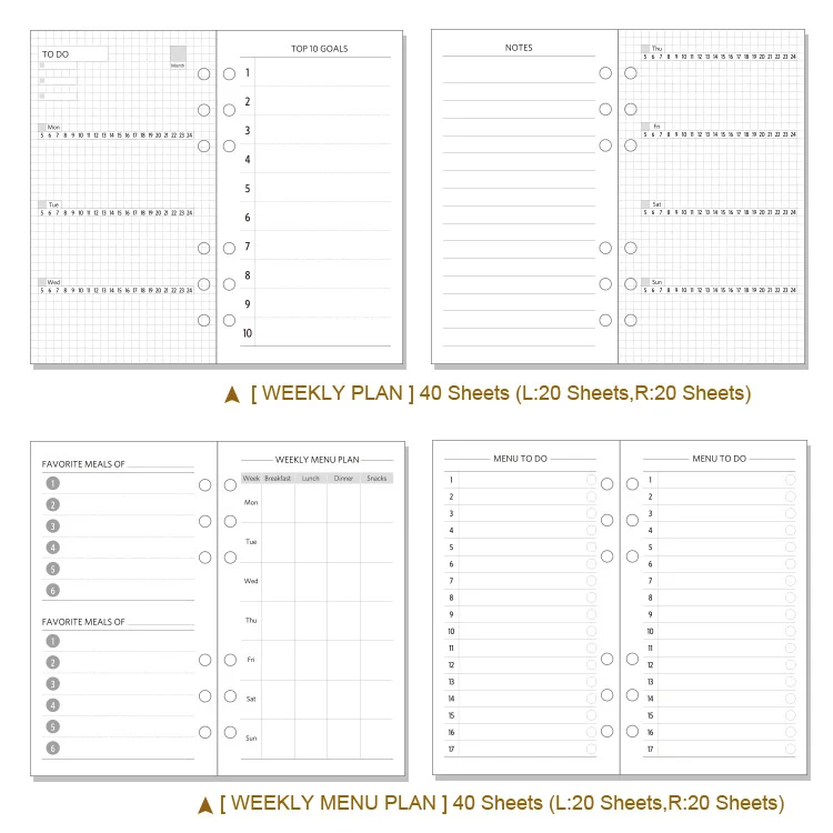 Бумаги для блокнота формата А6, формат еженедельного плана в клетку и в точку, 40 листов, Канцтовары