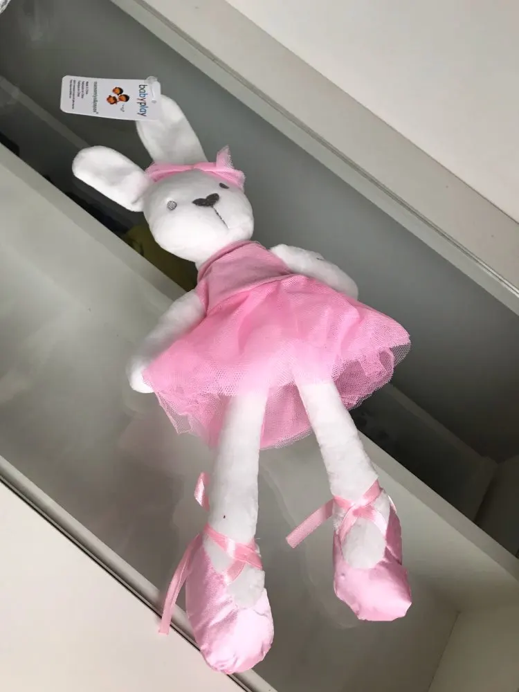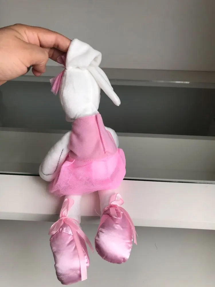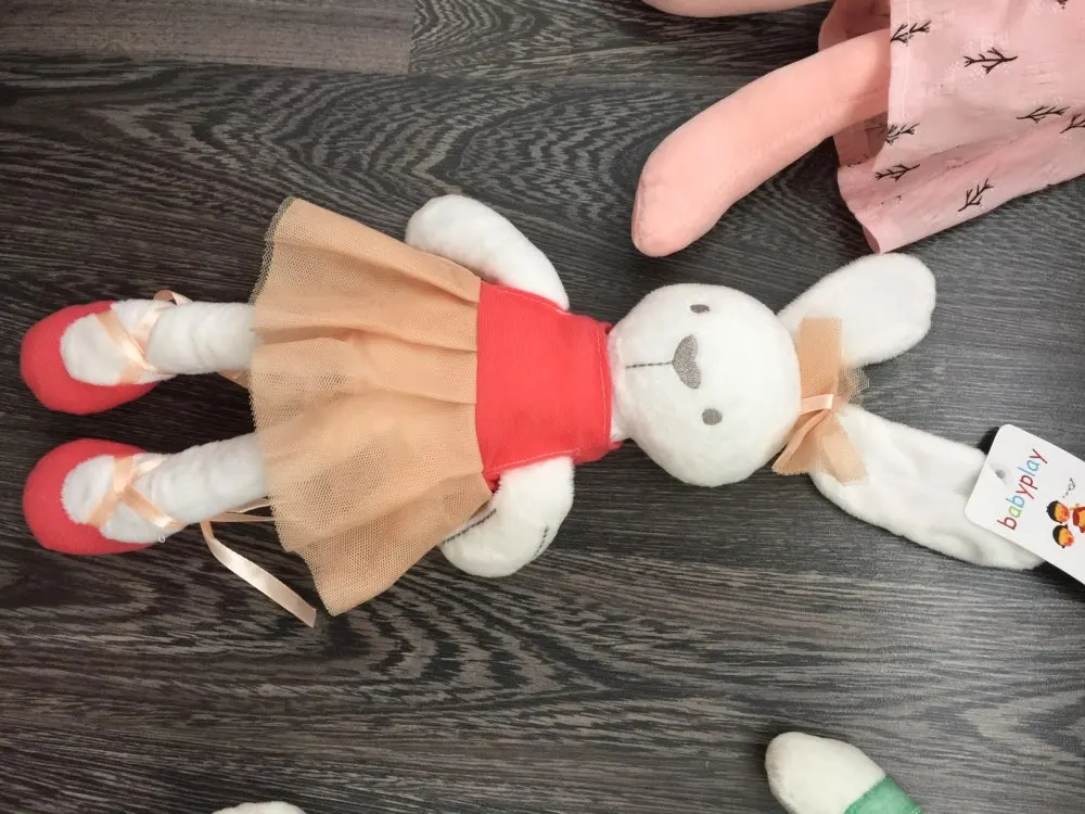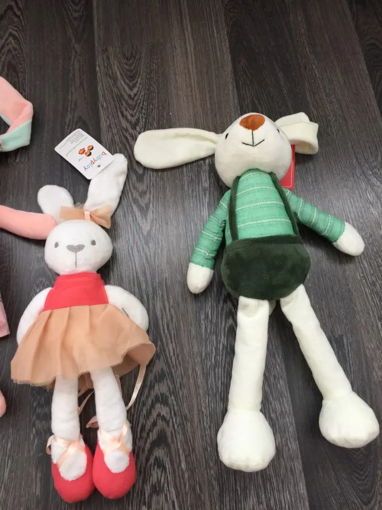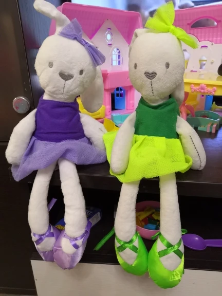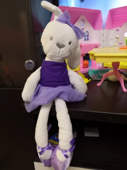 Зайчик хороший, мягкий. Дочке в 1,5 года нравится. Одежда съёмная. Глазки вышитые. Минус на мой взгляд разная длина ушей