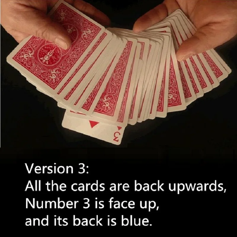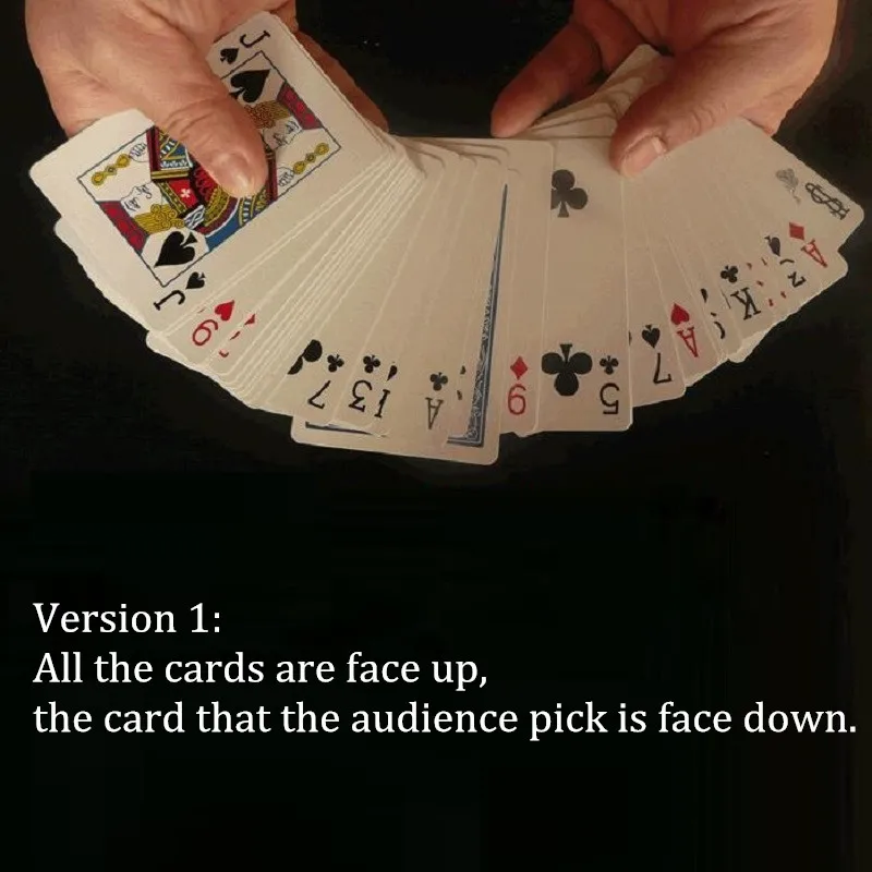 Волшебник выдает невидимую колода карт (действительно ничего) и инструктирует зрителя, чтобы он выбрал карту, а затем поместил обратно в палубу лицом вверх. Волшебник извлекает невидимую палубу и волшебно делает ее видимой. Но чтобы доказать, что это действительно та же колода, которую использовал зритель. Он расправляет палубу, и их карта-это единственная карта, обращенная в противоположную сторону. Нагнетатель ума!