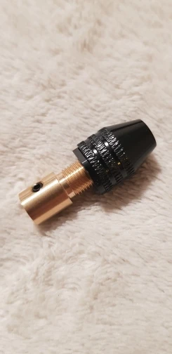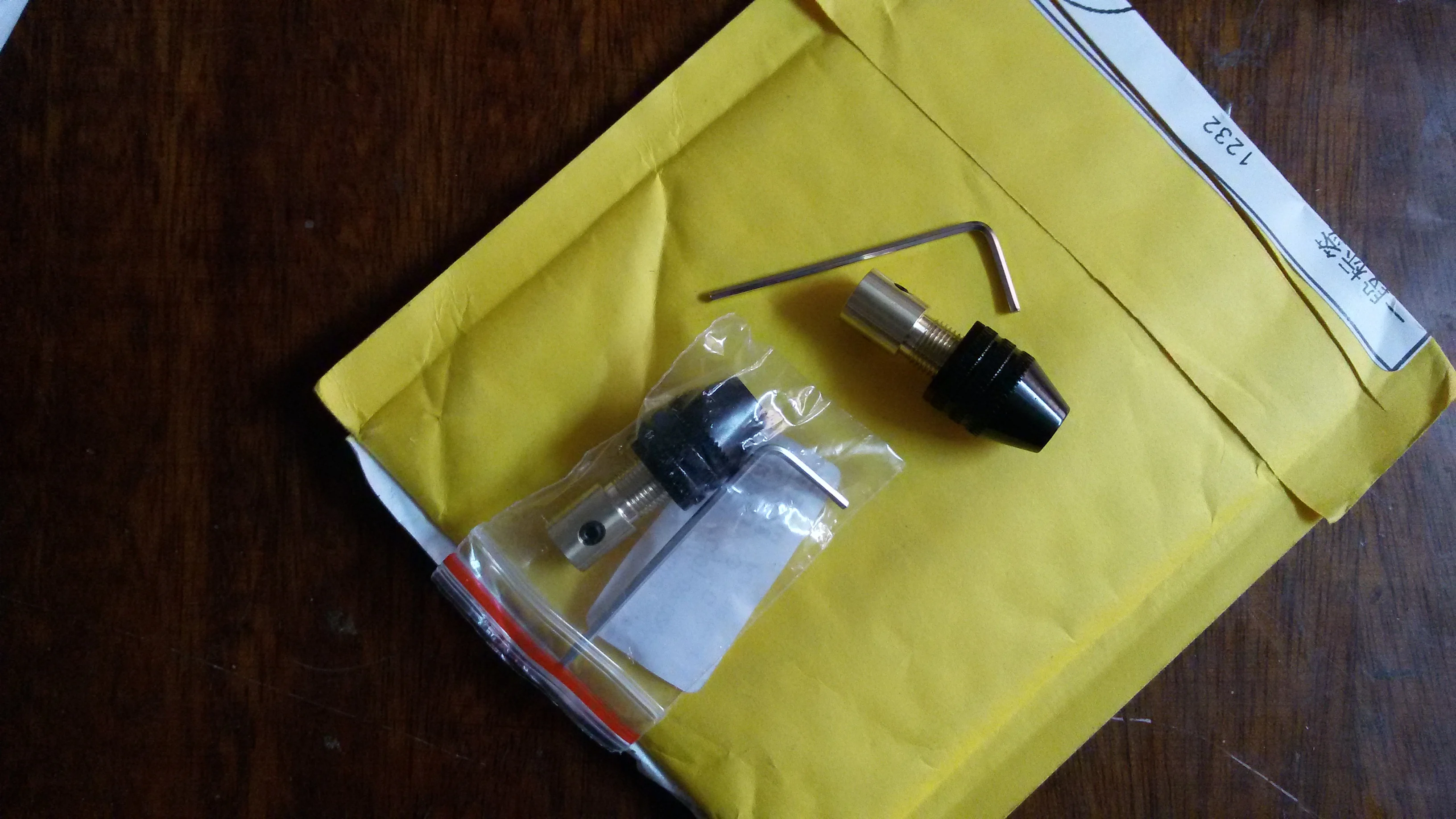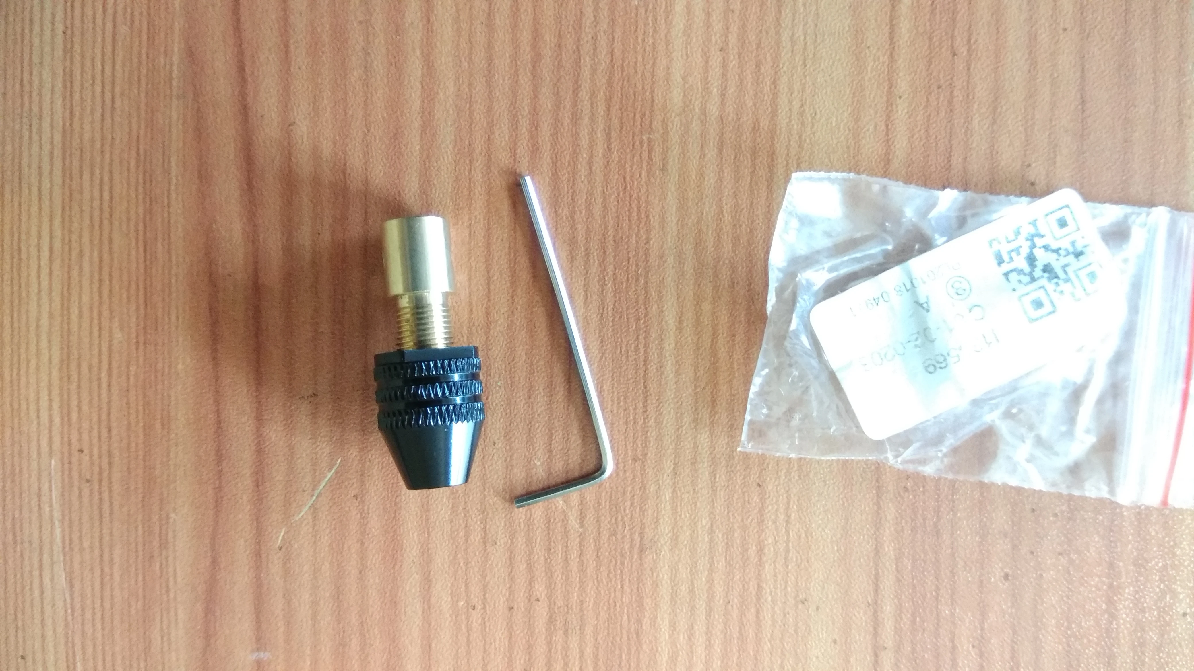 Чтобы установить на вал диаметром 3 мм, использовал отрезок трубки от телескопической антенны с продольной прорезью. Сел плотно, не бьёт, свёрла держит надёжно. В Петербург посылка шла 2 месяца.