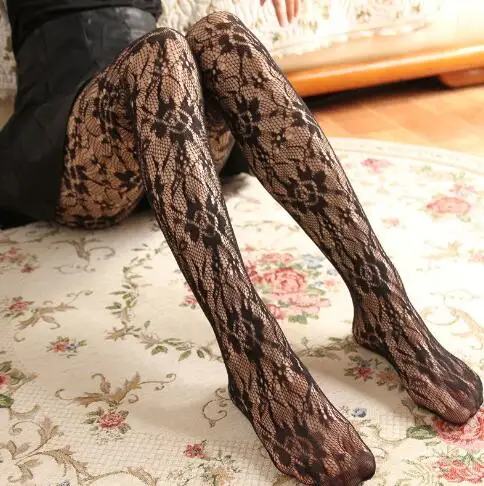 Колготки женские, сетчатые, черные, с цветочным кружевом