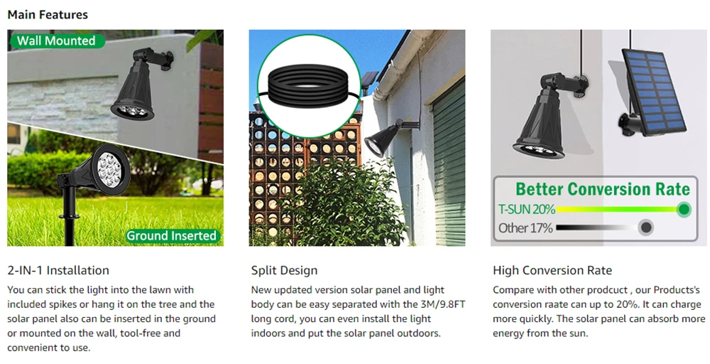 T-SUN 7 светодиодов, солнечный Точечный светильник IP65, водонепроницаемый Солнечный садовый светильник, солнечный настенный светильник, солнечный светильник с фиксированным цветом, Солнечная лампа для улицы