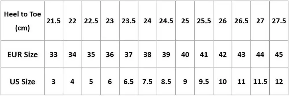 Длина стопы 21,5 см = EUR 33 = Выберите US3Длина стопы 22 см = EUR 34 = Выберите US 4Длина стопы 22,5 см = размер 35 (ЕС) = выберите Ваш американский размер-5Длина стопы 23 см = Европейский 36 = Выберите американский размер 6Длина стопы 23,5 см = EUR 37 = выбирают нас 6,5При длине стопы 24 см) = размер 38 (ЕС) = выбирают нас 7,5Длина стопы 24,5 см = РАЗМЕР 39 (ЕС) = Выберите Размер 8,5 (США)Длина стопы 25 см = европейский 40 = Выберите американский размер 9Длина стопы 25,5 см = Европейский размер 41 = выбирают нас 9,5Длина стопы 26 см = Европейский 42 = Выберите американский размер 10Длина стопы 26,5 см = размер 43 (ЕС) = Выберите 11 (США)Длина стопы 27 см = европейский размер 44 = выбирают нас 11,5Длина стопы 27,5 см = европейский размер 45 = Выберите 12 (США)