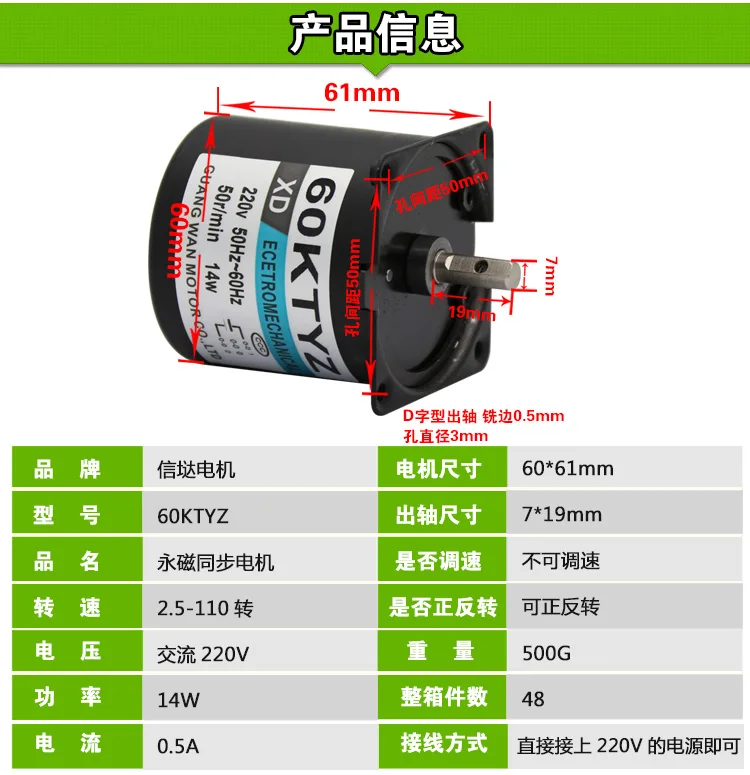 Модель: 60KTYZ Мощность: 14 Вт Напряжение: 220 В переменного тока Ток: 0,5 А Размер двигателя: 60*61 мм Размер вала: 7*19 мм Поддерживает CW / CCW, не поддерживает контроль скорости