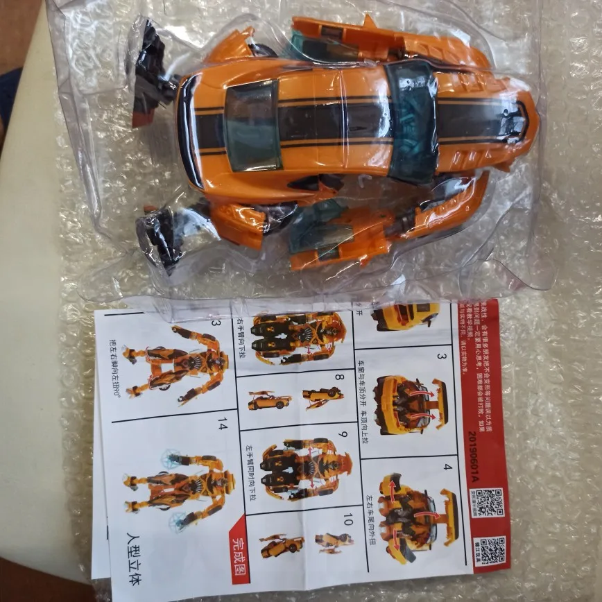 Трансформер пришёл в пластиковом прозрачном блистере. Без коробки. Был упакован в пупырку. Нормально доехал. Есть инструкция в комплекте. Трансформируется достаточно сложно. Может все так трансформеры, не знаю - первый раз у меня такой робот. Некоторые детали сложно повернуть, развернуть, сложить. Может разработается. Если поавильно собрать машинку, то она достаточно прочная получается, не разваливается
