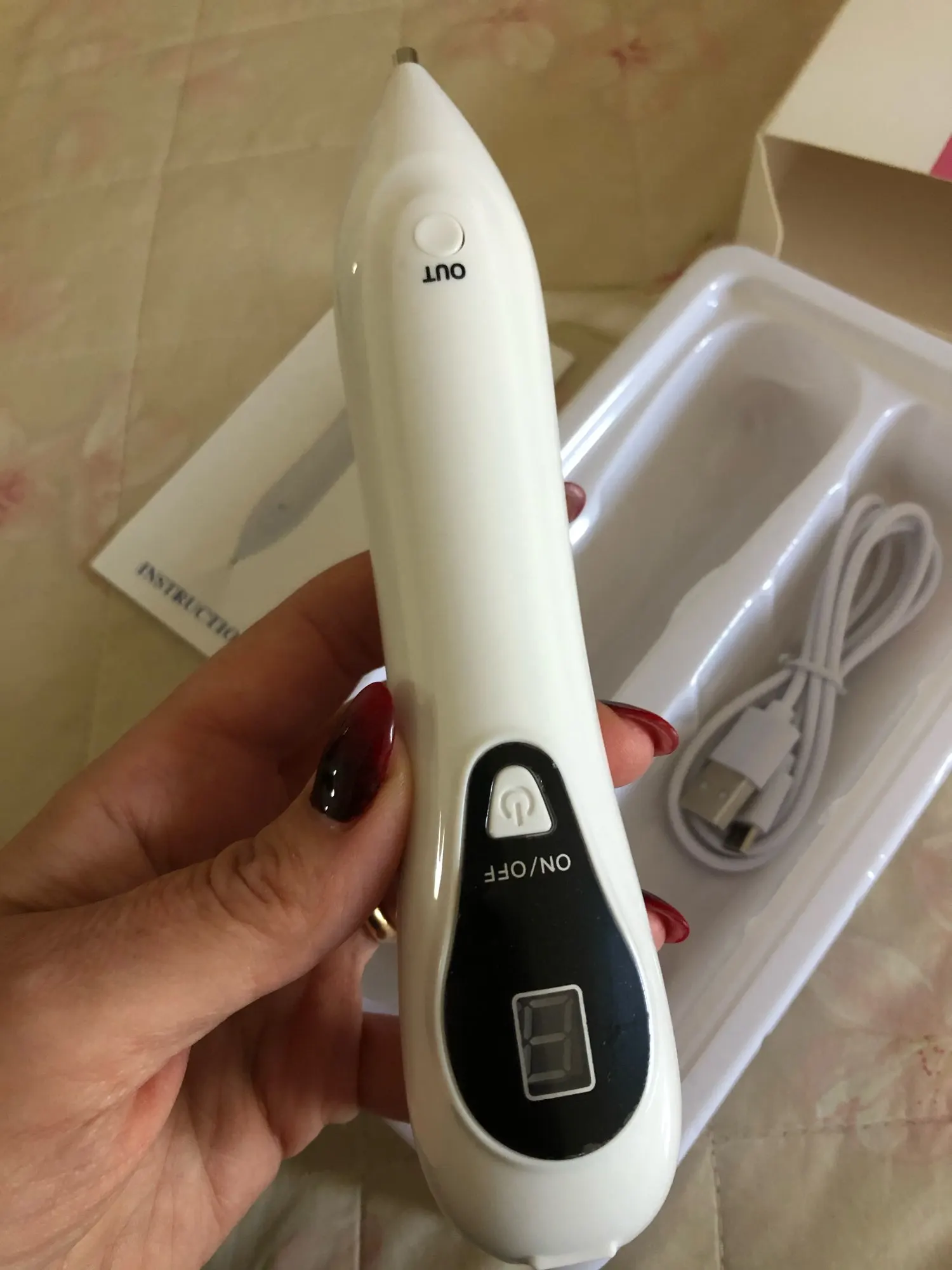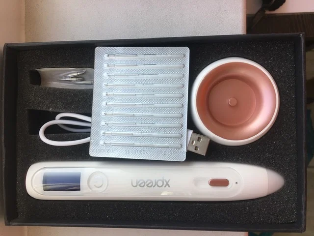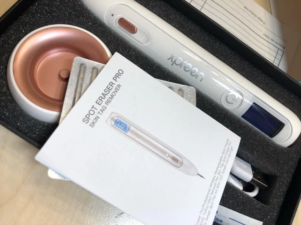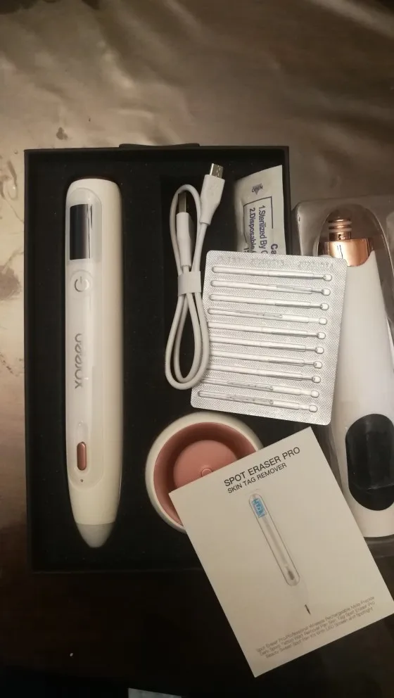 Лазерная ручка для удаления бородавок, родинок, попилом. Аппарат сразу внушает доверие, все запаковано, иголки все стерильны. Ручка небольшого размера, поэтому ей весьма удобно пользоваться в домашних условиях. В комплекте идёт: сам комплект, USB зарядка (вместе с подставкой), инструкция на английском языке, 10 маленьких тонких иголок и 3 иголки более крупного размера. Аппарат имеет несколько режимов, поэтому он справится и с попиломой и с бородавкой. Достаточно прост в использовании, у меня трудностей не возникло. При сжигании на коже чувствуется лёгкое жжение, но это терпимо. Через несколько дней корочка отпадает и здравствуй гладкая кожа! Доставка быстрая, всего три дня, домой принёс курьер. К заказу однозначно рекомендую, это намного дешевле, чем ходить в клинику.