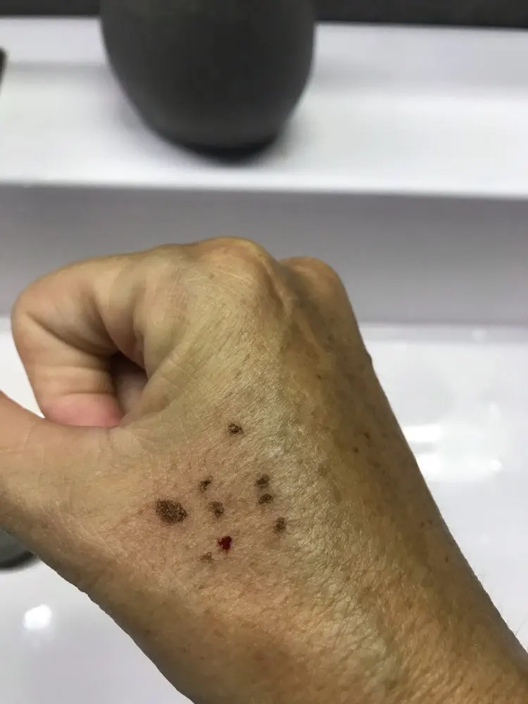 Аппарат отличный, работает качественно, на малой мощности, можно без анестезии убирать образования. У меня тонкая, чувствительная кожа, делала на единице, но у меня долго заживает и остаются пятна, со временем думаю всё рассосётся. На фото, пятна после удаления родинок две недели назад.