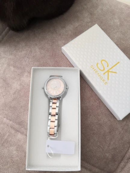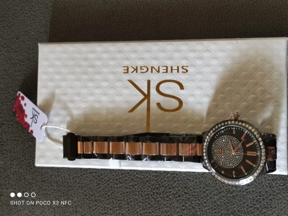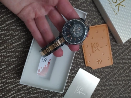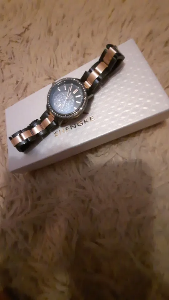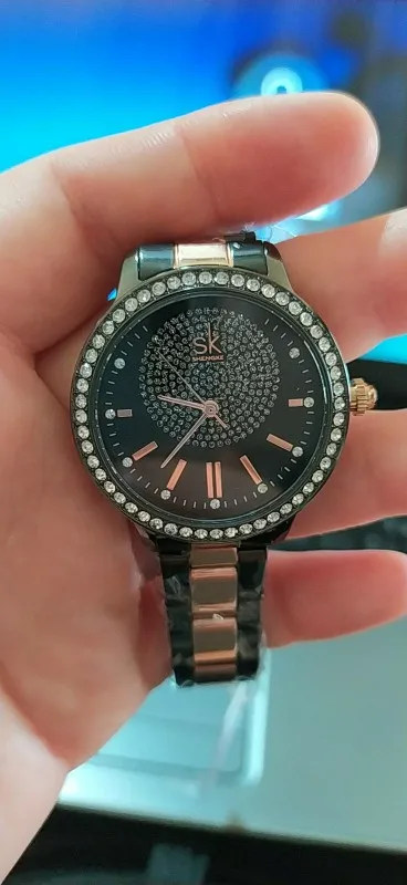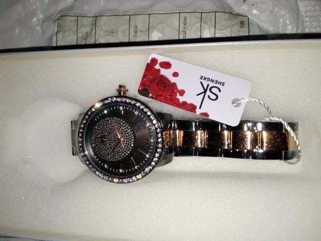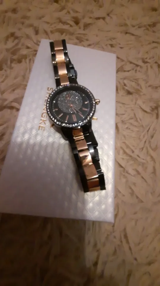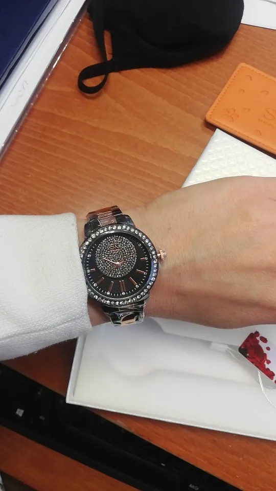Часы Shengke женские кварцевые, роскошные черные японские наручные часы с кристаллами, цвет розовое золото, гарантия 6 месяцев