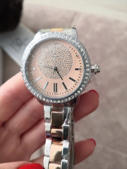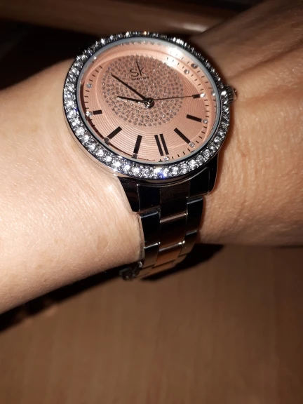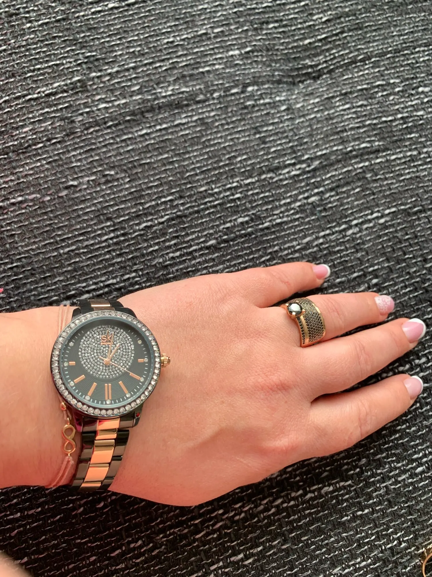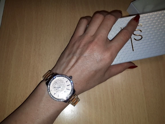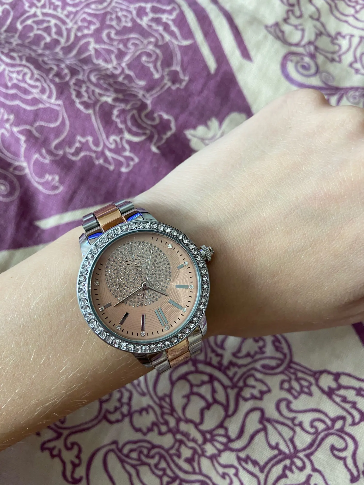 Красивые часы! На ручке смотрятся очень элегантно. Упакованы в коробку, сами обернуты плёночной. Циферблат толстый, думала будет тоньше. Звенья из достаточно лёгкого металла. Браслет большой, убирала 4 звена. Часами довольна! Смотрятся красиво. Надеюсь, при носке цвет не сотрётся и не потемнеет.