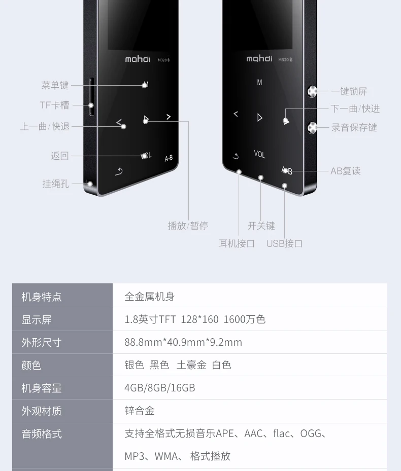 Mp3-плеер Mahdi M320, металлический, спортивный, портативный, bluetooth, 4G8G16G, со встроенным динамиком, FM-радио, музыкальный плеер APE Flac
