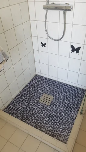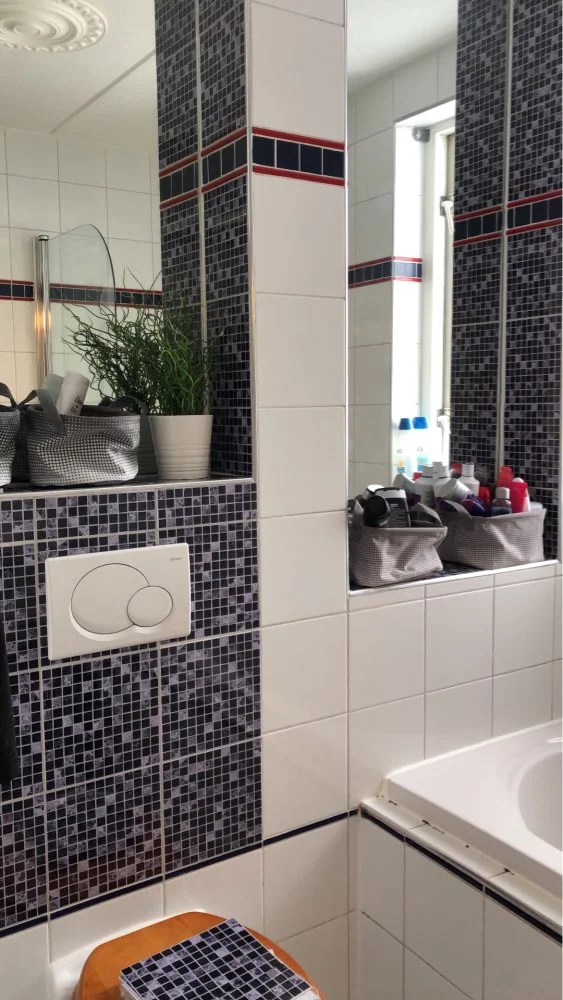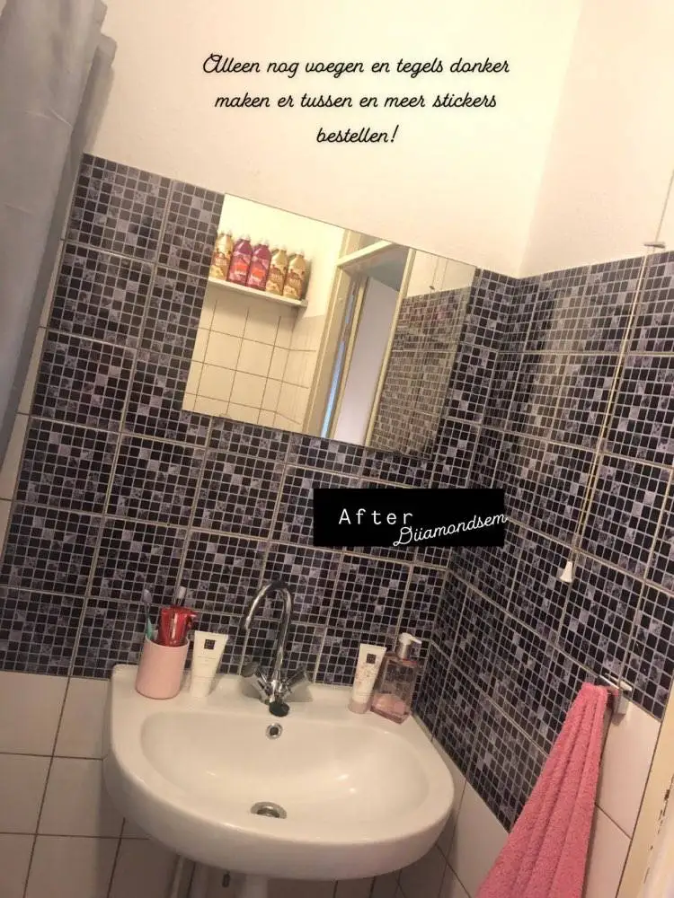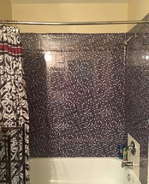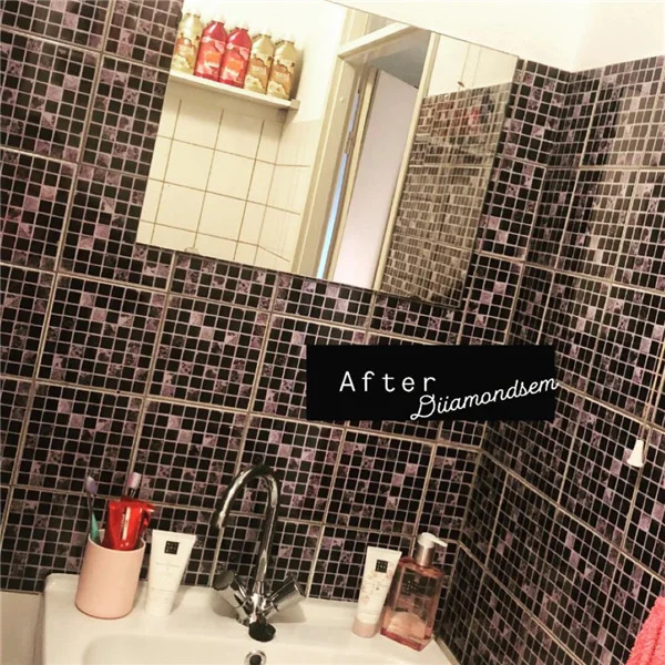 Вы можете сказать, что они не плитки, потому что они очень блестящие, но если вы такие же, как я, и это ваш баланс, это отличный способ. Он отлично выглядит в моей ванной комнате и придает ей вид, соединенный между собой. Я заплатил кому-то, чтобы положить его, и это было ветерко.