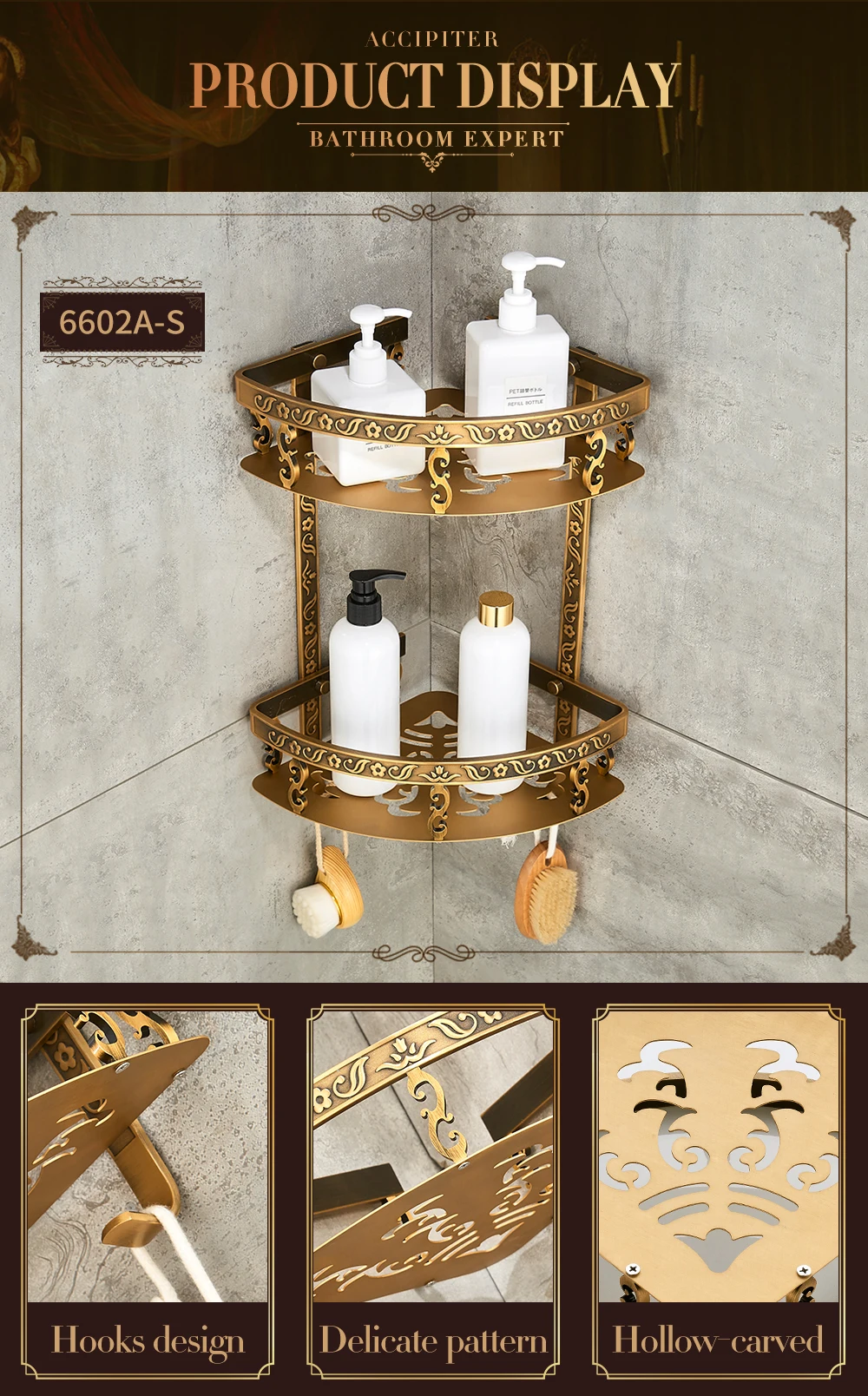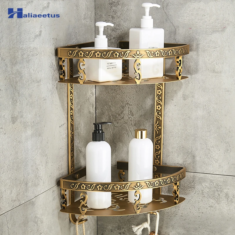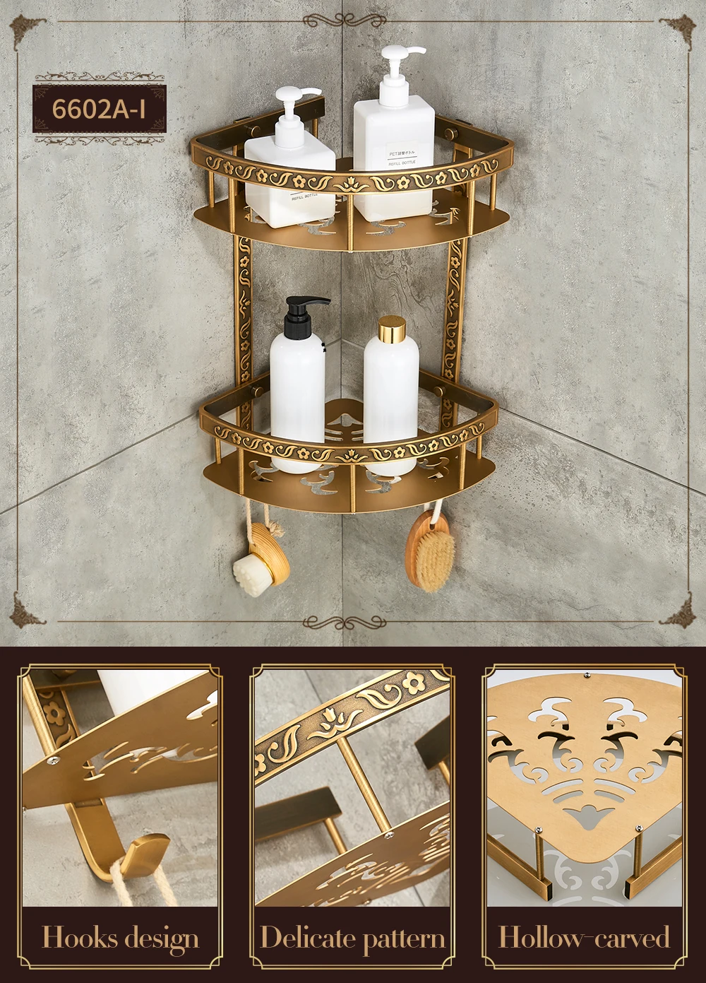 Двухуровневая Античная Металлическая угловая полка для ванной комнаты, настенное крепление, полка для хранения шампуня, треугольная Полка для полотенец