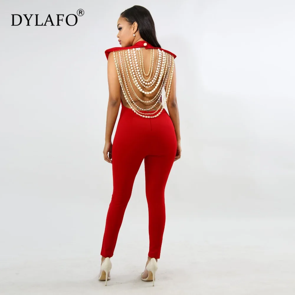 Женский обтягивающий комбинезон без рукавов, с жемчужными цепочками и открытой спиной, повседневный комбинезон с кисточками для вечеринок