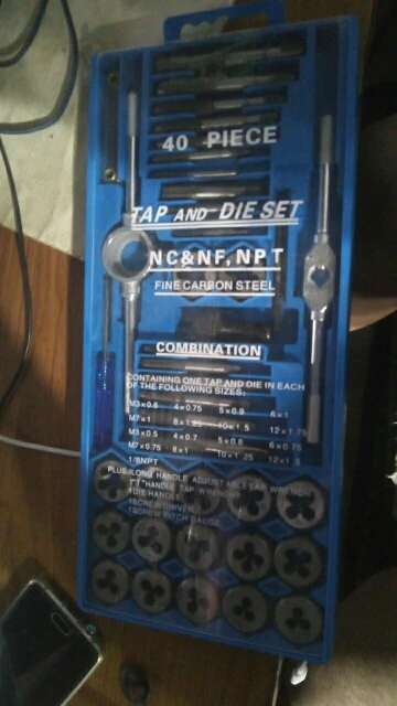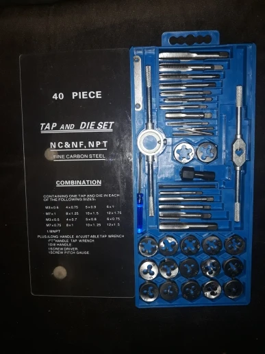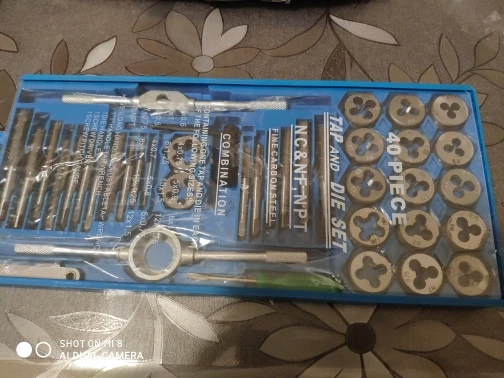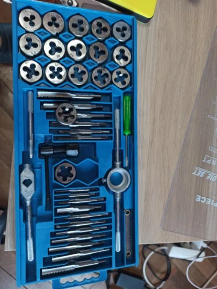 Быстрая доставка. Доставлено курьером до квартиры. Упаковка хорошая, всё прибыло без трещин и прочего на самой коробке. Качество с виду - поправить резьбу только, или с мягким металлом работать. 12 ю резьбу этим набором скорее всего не нарезать ни когда - держатели не внушают доверия ))) По работе очень часто сталкиваюсь с нарезанием резьб, и токарем )) чото другое всё на работе ))) Прикольный набор !