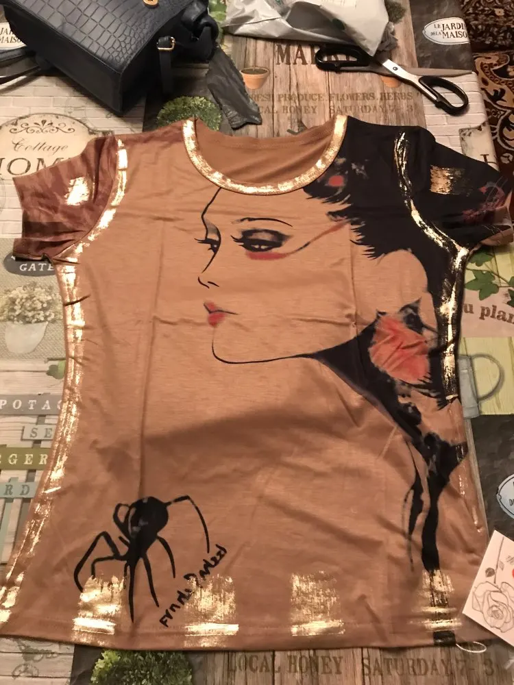 Футболка неплохая, такая же как на фото, выписывала цвет хакки, но пришла коричневая, мне кажется, что золотое напыление при стирке смоется.