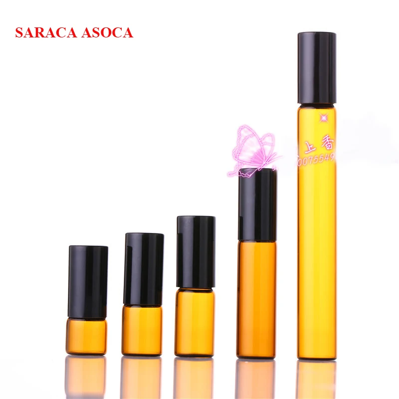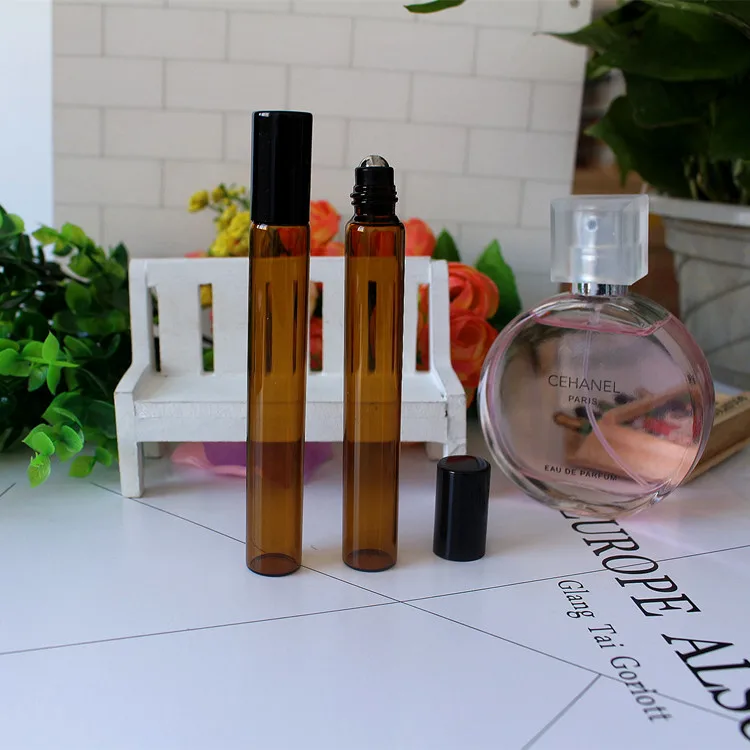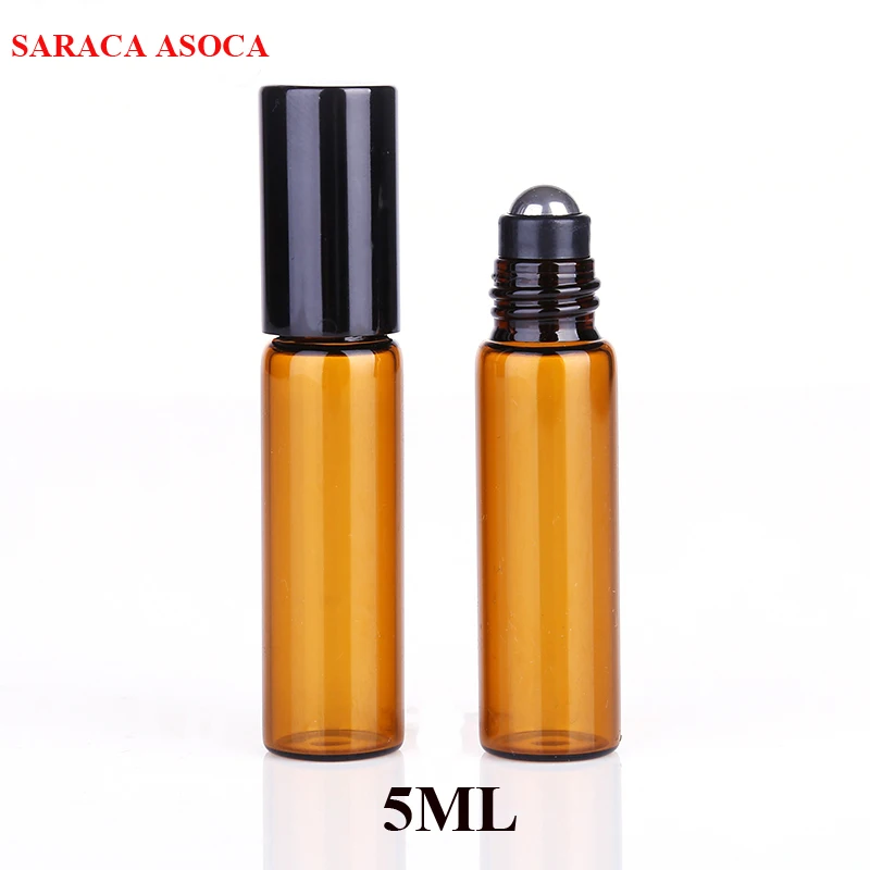 Оптовая продажа, розничная продажа, 5 мл, 100 шт.лот, мини-бутылки с шариками коричневого цвета, стеклянные бутылки с черным шариком, стальные шарики, стеклянные многоразовые бутылки с эфирным маслом