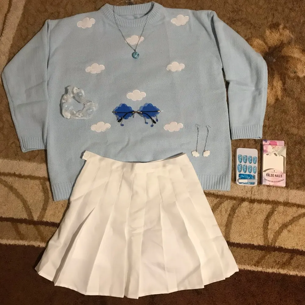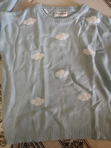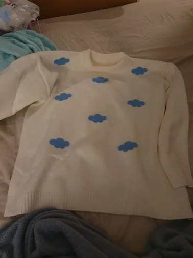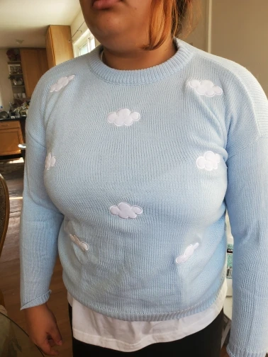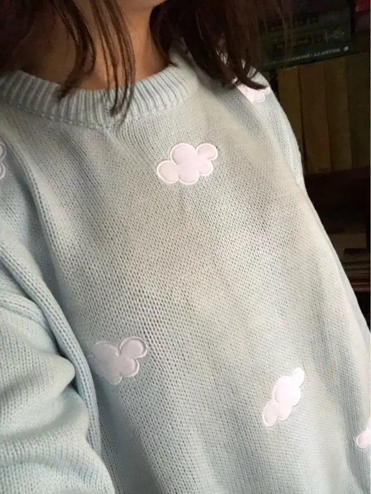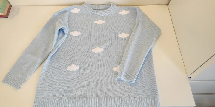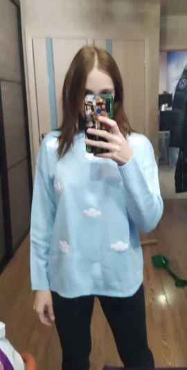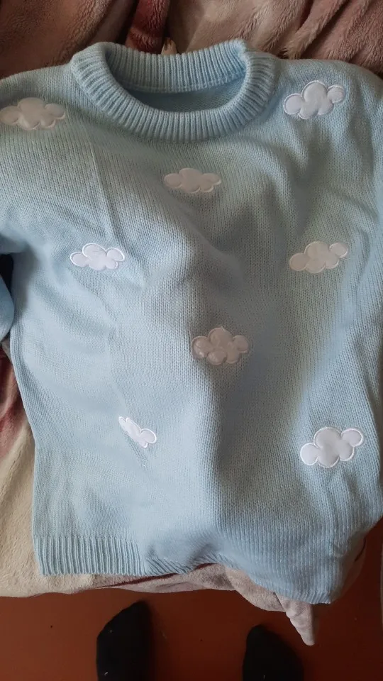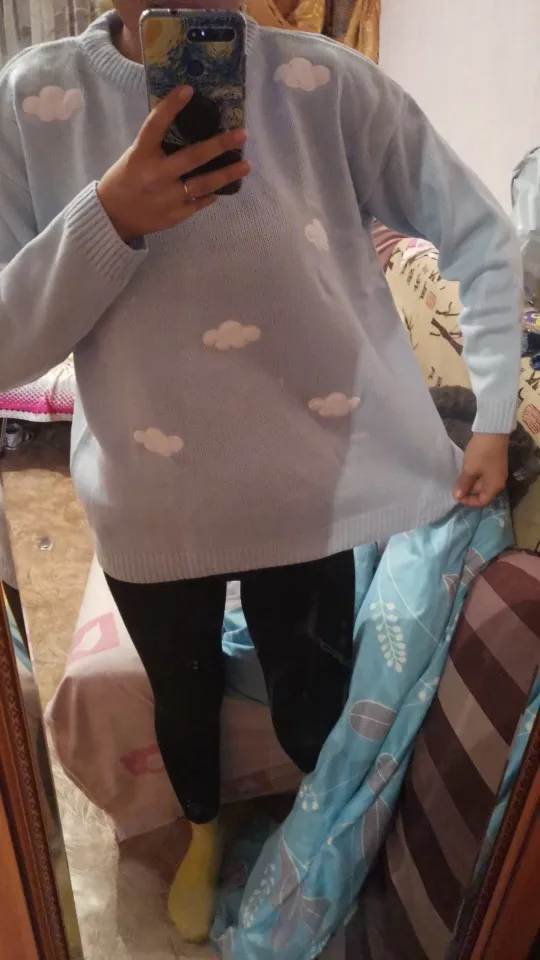Свитер очень приятный на ощупь, и он прибыл в Великобританию через 8 дней. Материал достаточно плотный, а облака сделаны из мягкого пушистого материала. Обычно я ношу размер S, а свитер хорошо сидит, это довольно большой размер, но рукава могут быть немного длиннее, и они не такие широкие, как на фото (я всего лишь 161 см так не очень высокий). Я также получил чокер в подарок.