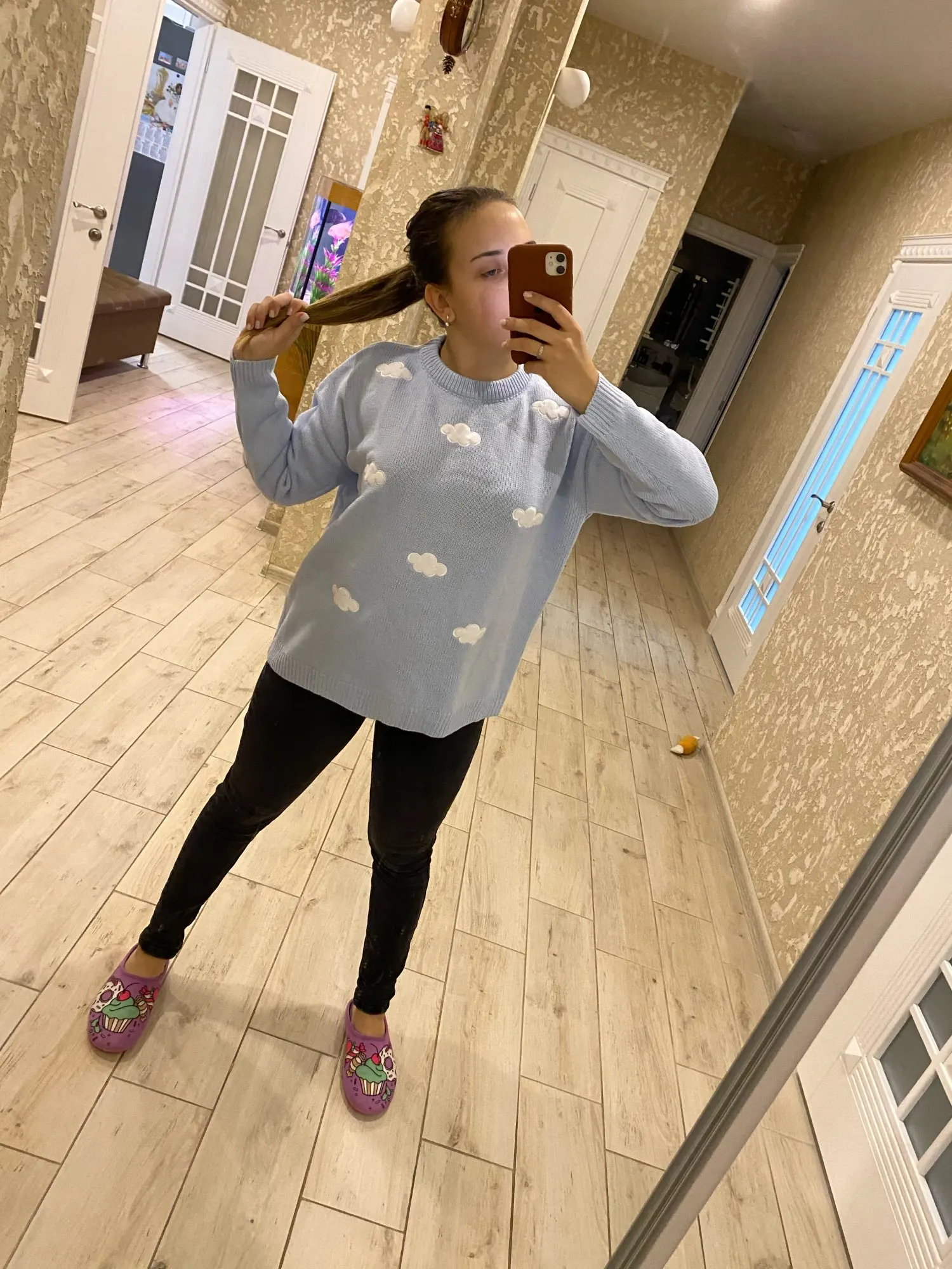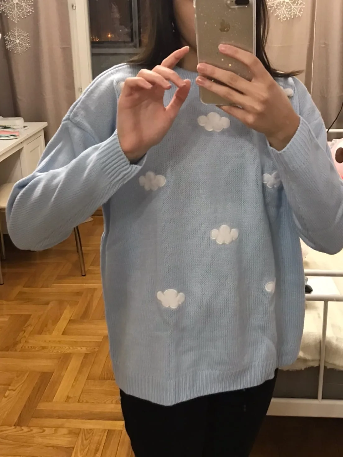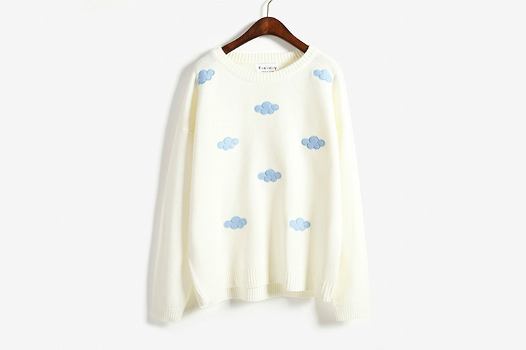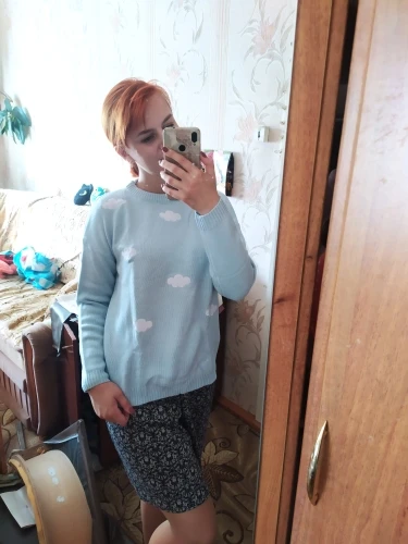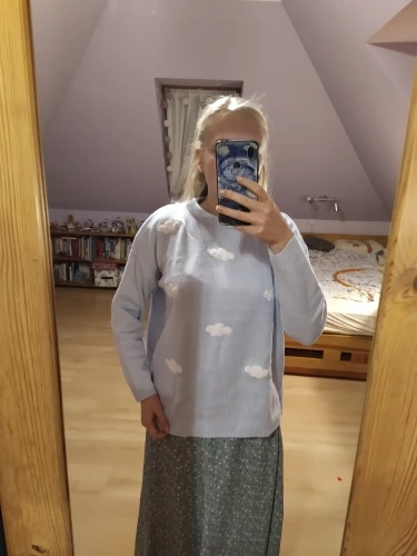 Свитер очень приятный на ощупь, и он прибыл в Великобританию через 8 дней. Материал достаточно плотный, а облака сделаны из мягкого пушистого материала. Обычно я ношу размер S, а свитер хорошо сидит, это довольно большой размер, но рукава могут быть немного длиннее, и они не такие широкие, как на фото (я всего лишь 161 см так не очень высокий). Я также получил чокер в подарок.
