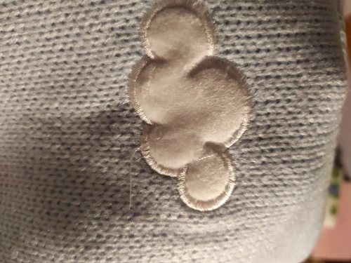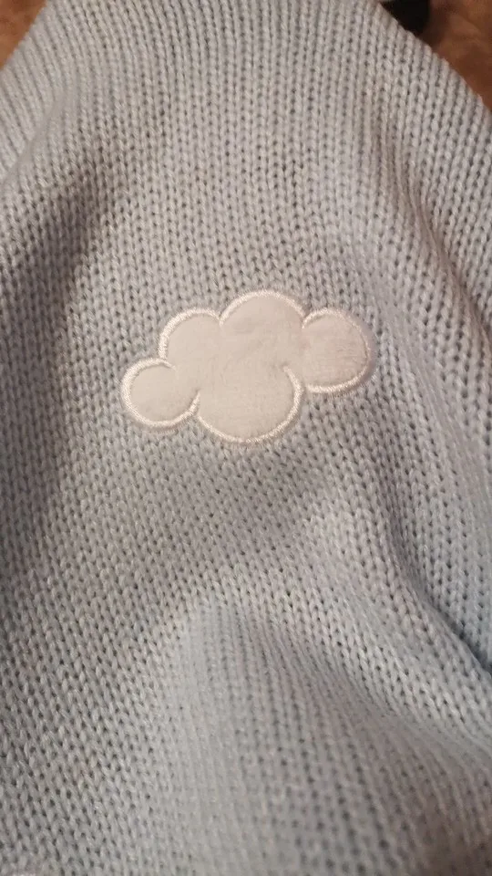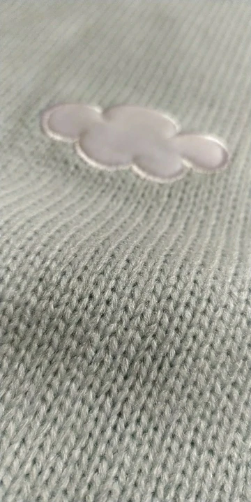 Свитер очень симпатичный, удобный и аккуратно сшитый, но несколько меньше заявленного. Мне на ОГ 100, ОТ 90 и Об 110 (до самого широкого места он не доходит) он сел как раз. Облака нашиты сверху, из другого материала, мягкие.