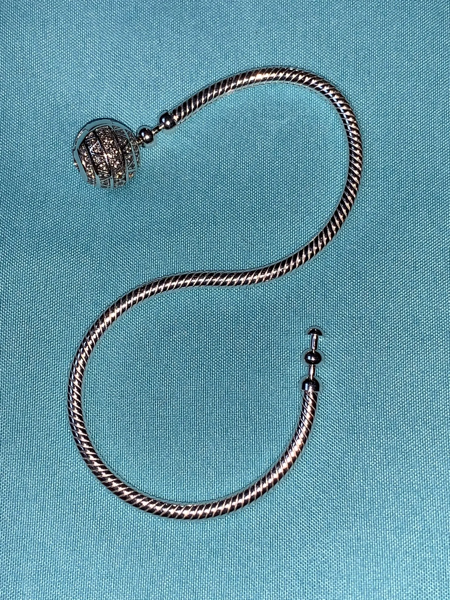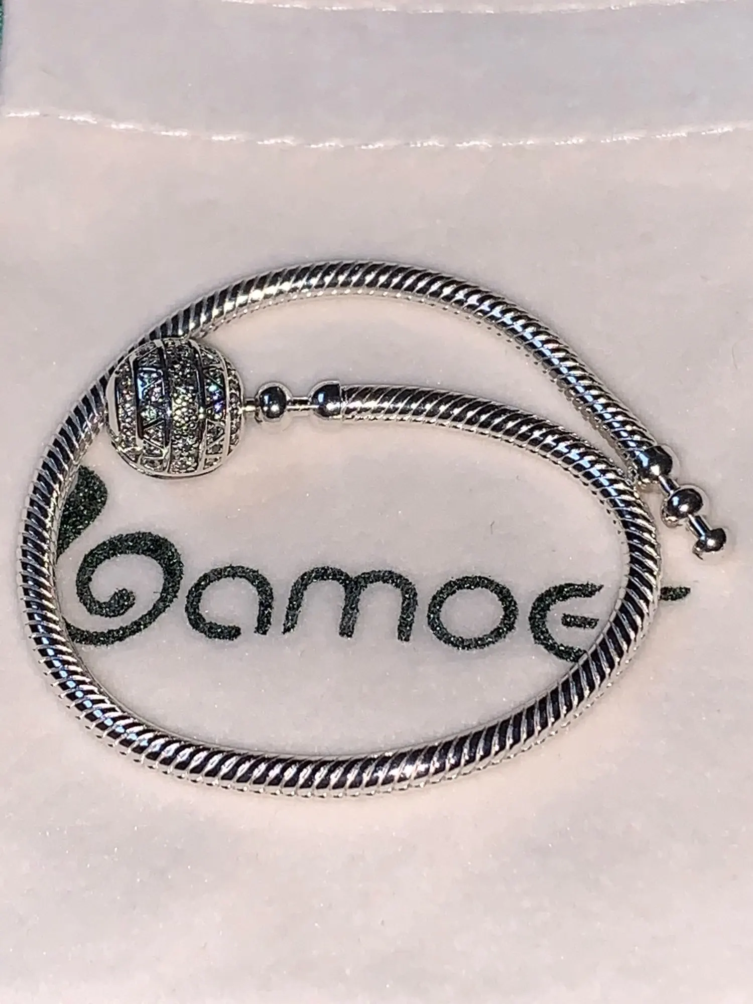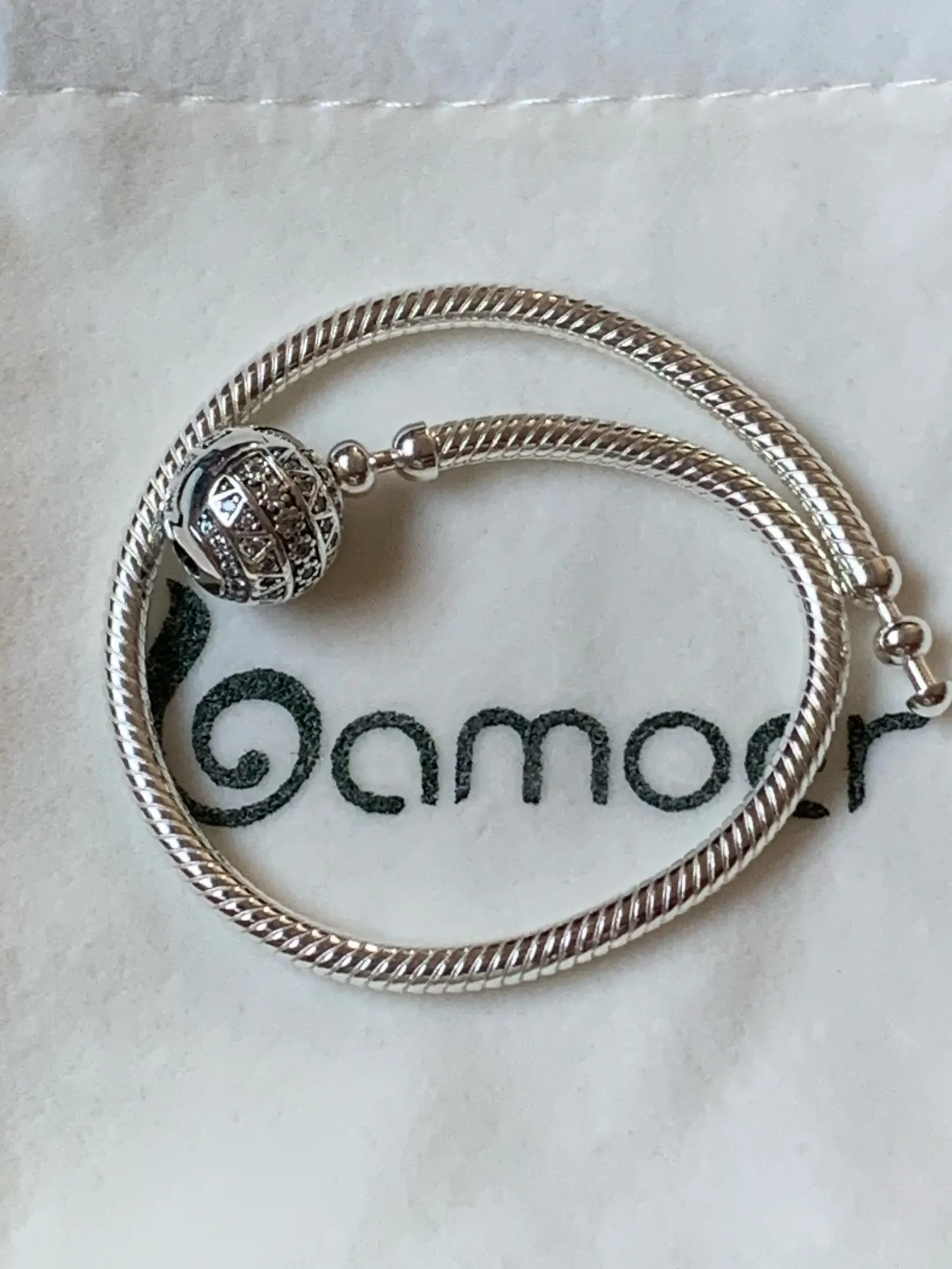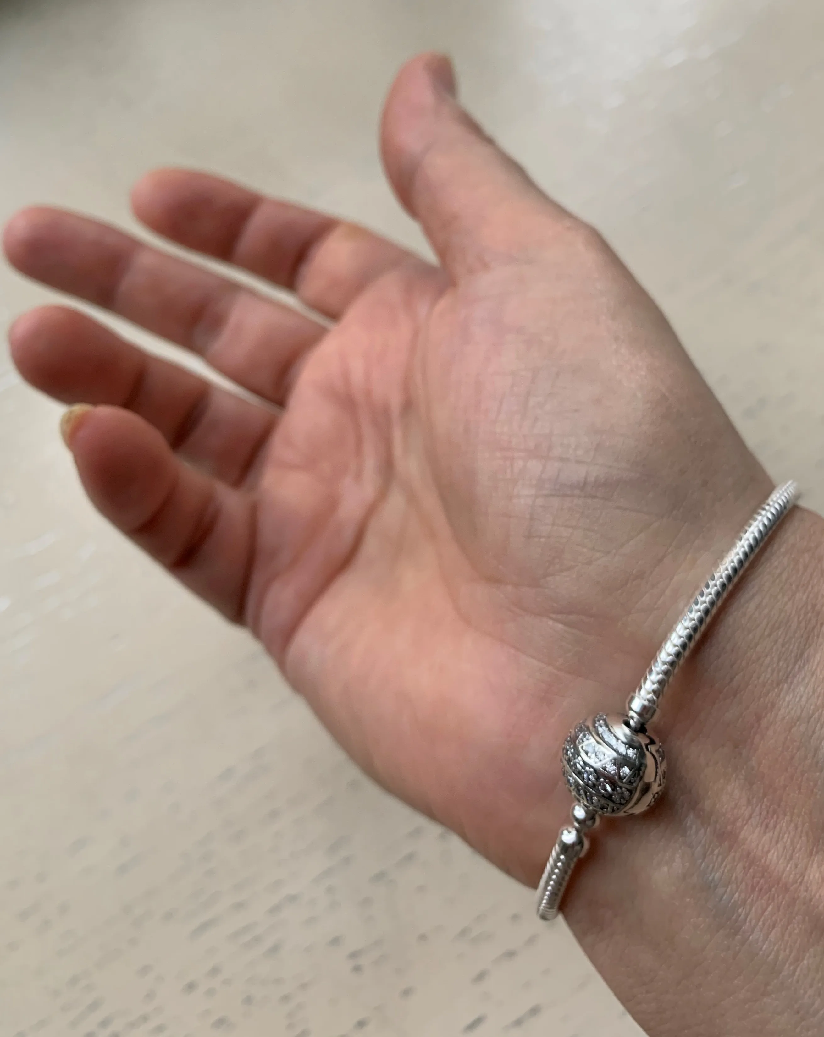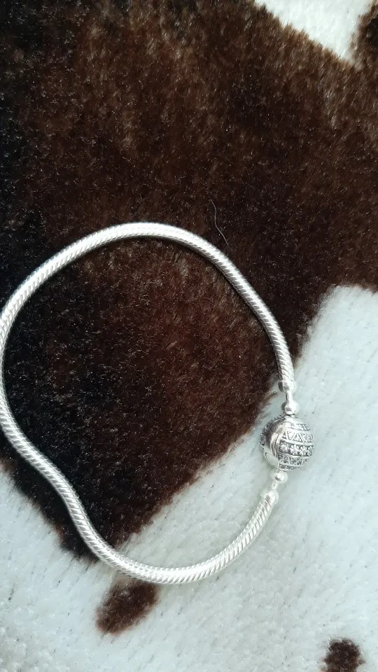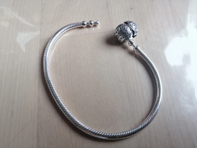 Прекрасный серебряный браслет. Гибкий браслет, надежный замок. На свое запястье 15 см взяла браслетик 18 см, чтоб одевать на него шармы. Мне очень нравится браслет. Покупала по акции с купоном 50%, достался за половину цены. Приобрела на распродаже шармы. Смотрится очень красиво. Рекомендую к покупке. В подарок мне еще подарили браслетик на ногу.