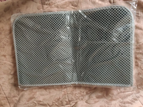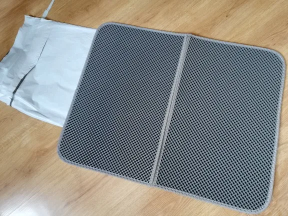 Невероятно быстро пришло, всего через два дня, т.к. заказывала из России. Принёс курьер. Упаковано аккуратно. Мой коврик самый большой, 55х70, состоит из двух частей, поэтому никаких заломов и сгибов. Каждая половинка на своей липучке. Запах есть, но надеюсь, быстро выветрится. Кошку не смущает. Наполнитель хорошо попадает в дырочки. Спасибо продавцу!