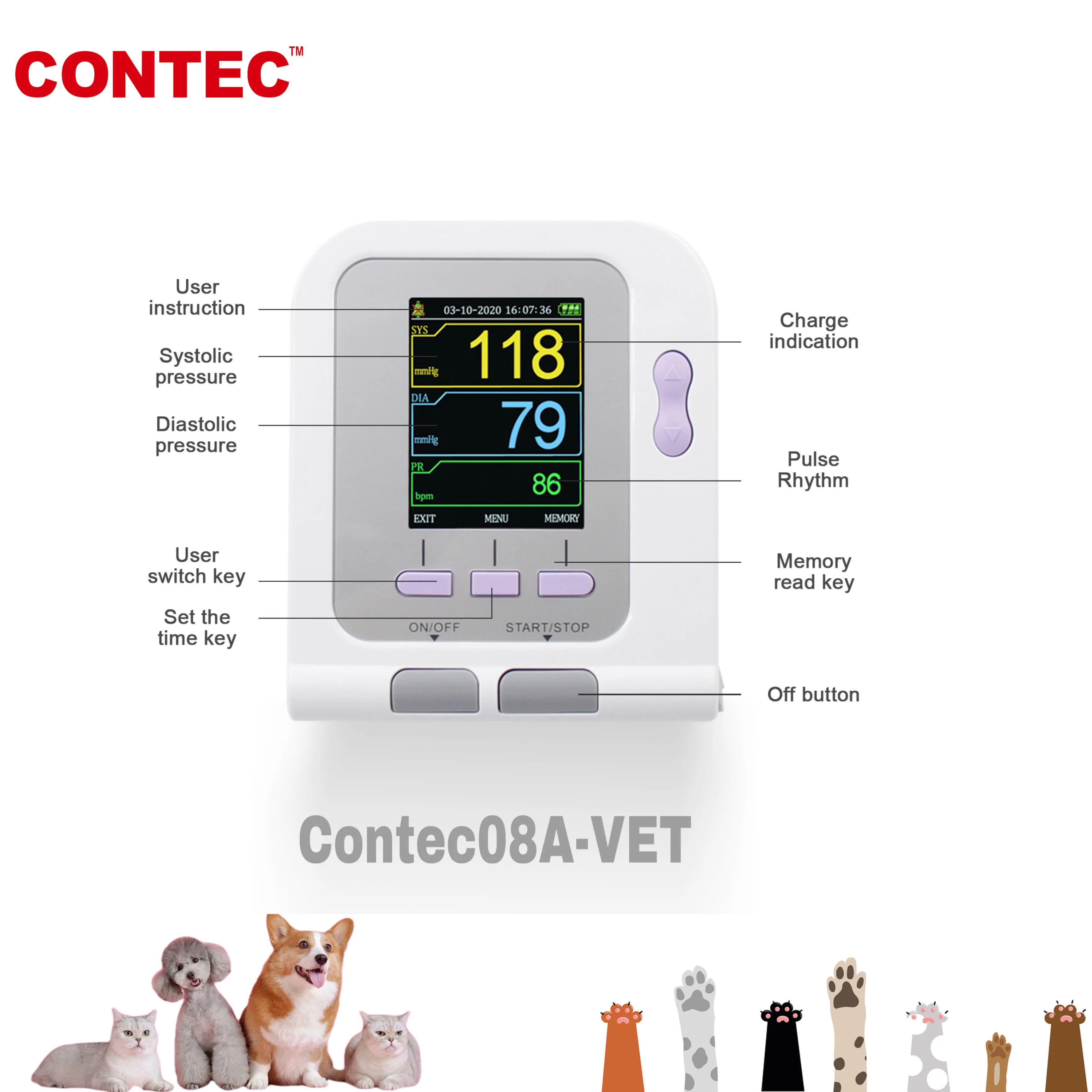 CONTEC ветеринарный OLED цифровой монитор артериального давления и сердцебиения NIBP CONTEC08A-VET + 3 манжеты