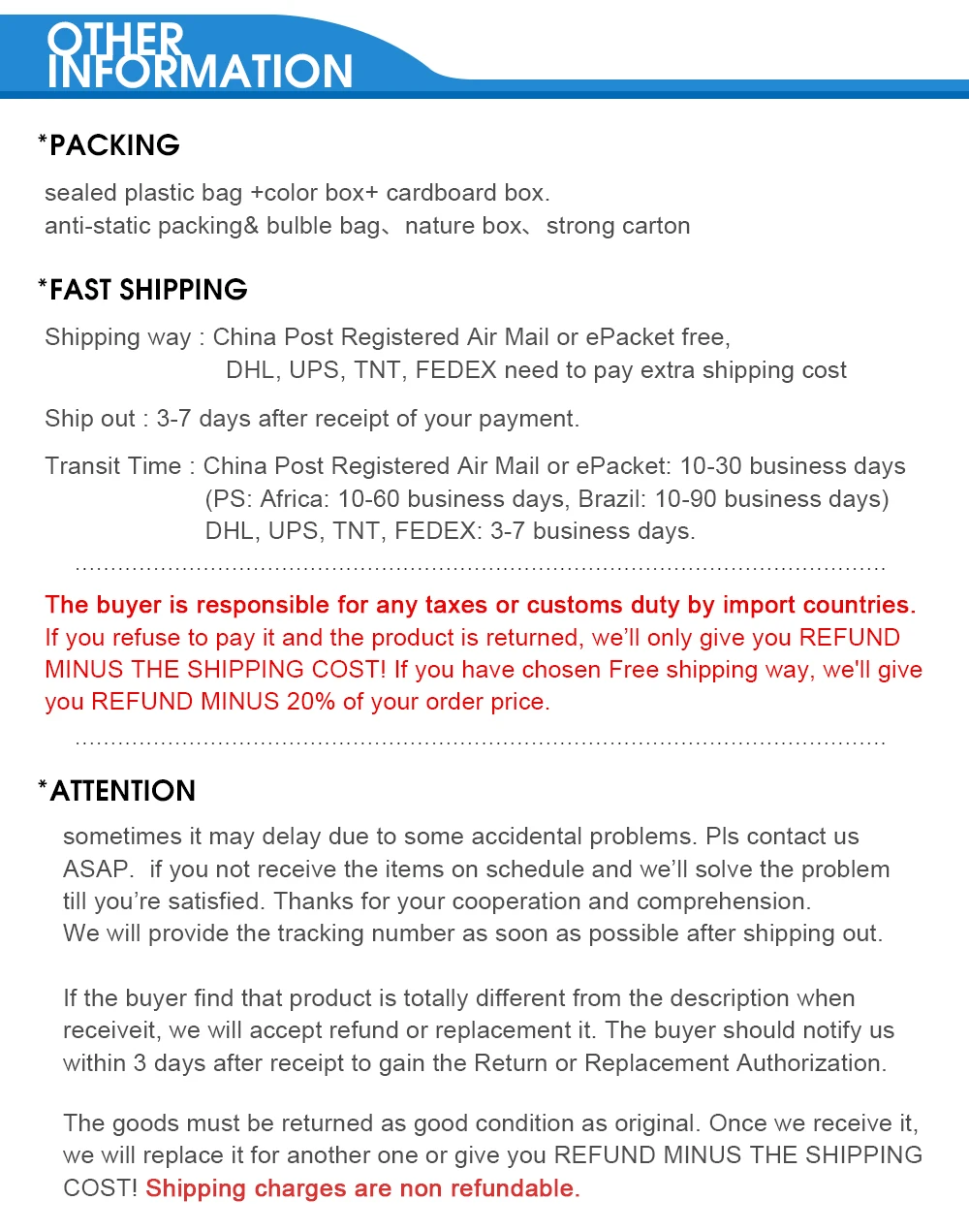 Прошло еще несколько дней, чтобы приехать к тому, что я сказал при заказе, но я связался с поставщиком, и они немедленно сделали все возможное, чтобы продлить время и извинились. Просто попробуйте их и посмотрите, как они выглядят. Спасибо.