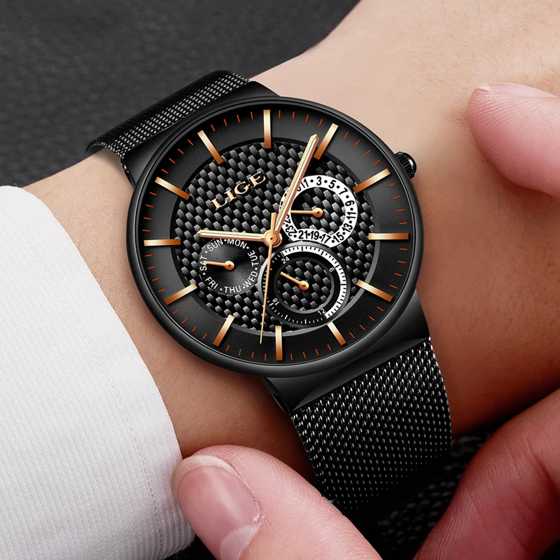 Часы наручные LIGE Мужские кварцевые, модные брендовые Роскошные повседневные водонепроницаемые спортивные с тонким стальным сетчатым браслетом, с датой