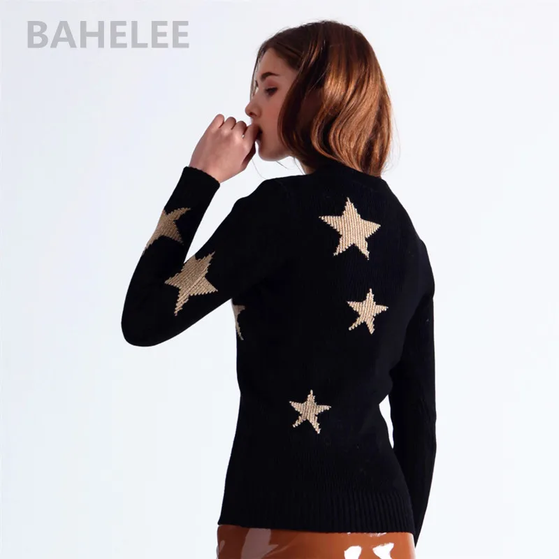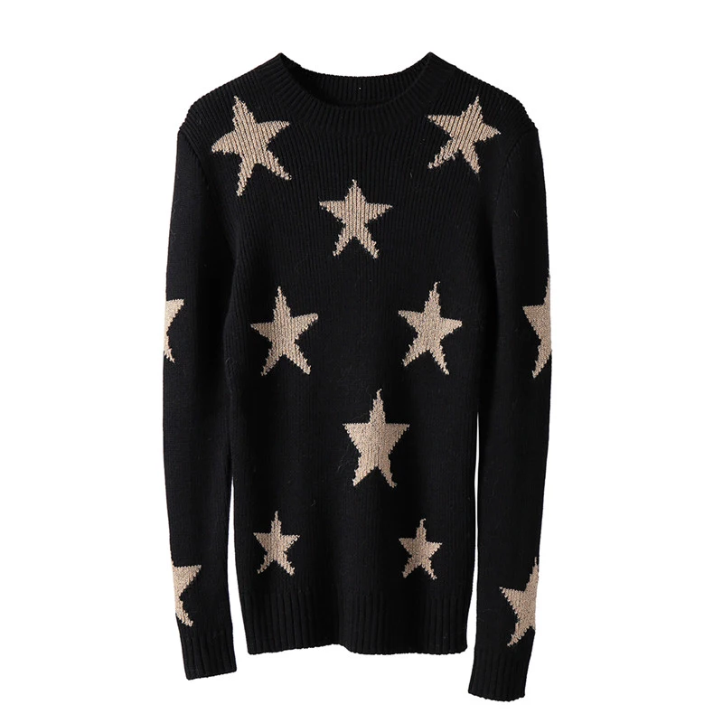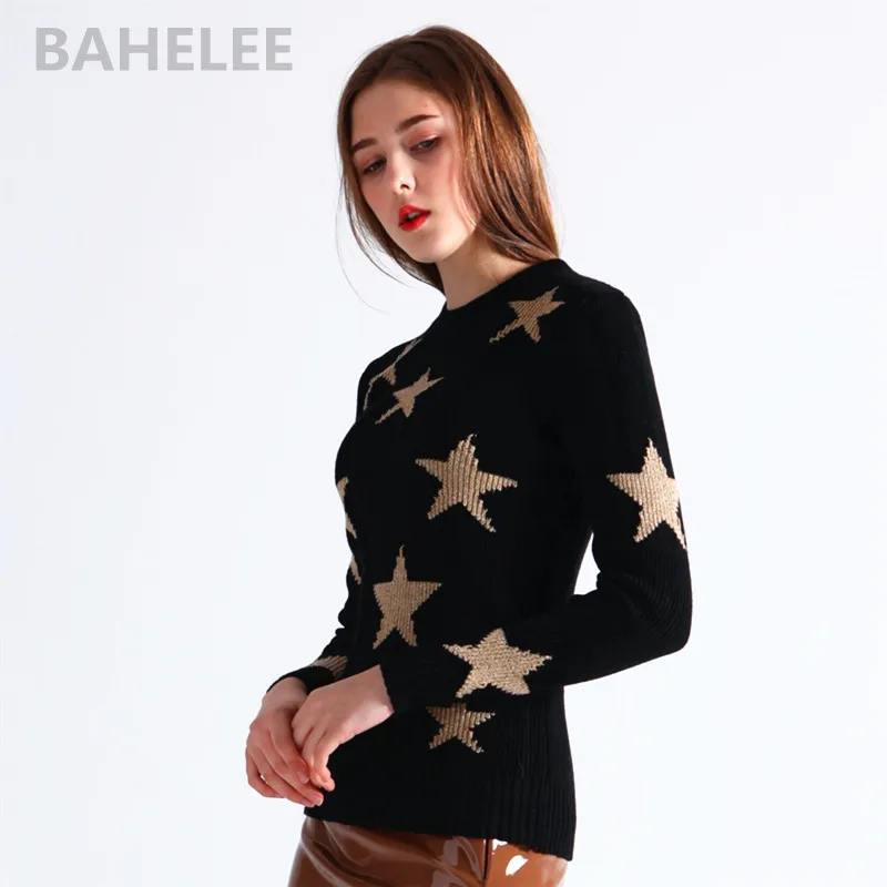 BAHTLEE осень Для женщин мериносовой шерсти нескатывающаяся верхняя одежда Полые Пуловеры; Свитер с О-образным вырезом с длинными рукавами костюм с оборками золотистого цвета, с узором, с изображением звезд