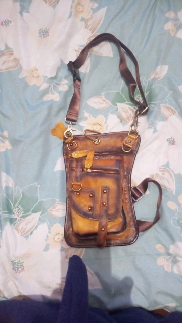 Мне очень понравилась эта сумка,не знаю может так и должно быть ,верхний ремень через плече с одновременным креплением к ноге коротковат,буду пристегивать за пояс и за ногу,так все четко,спасибо,изделие мягкое приятное!!!!не где не чё не торчит!!!