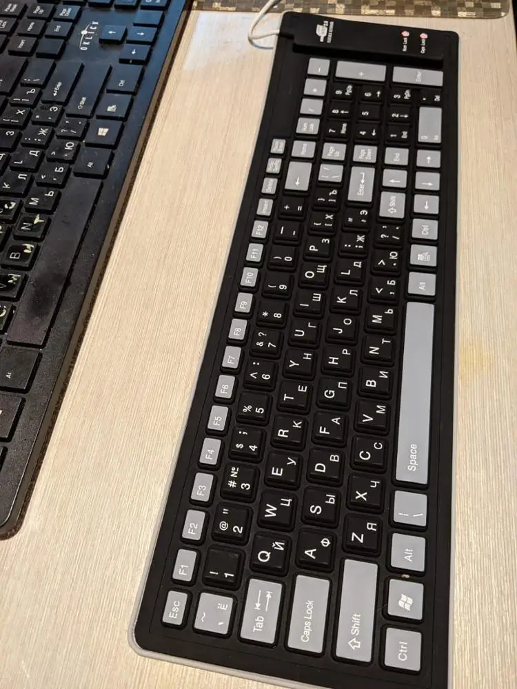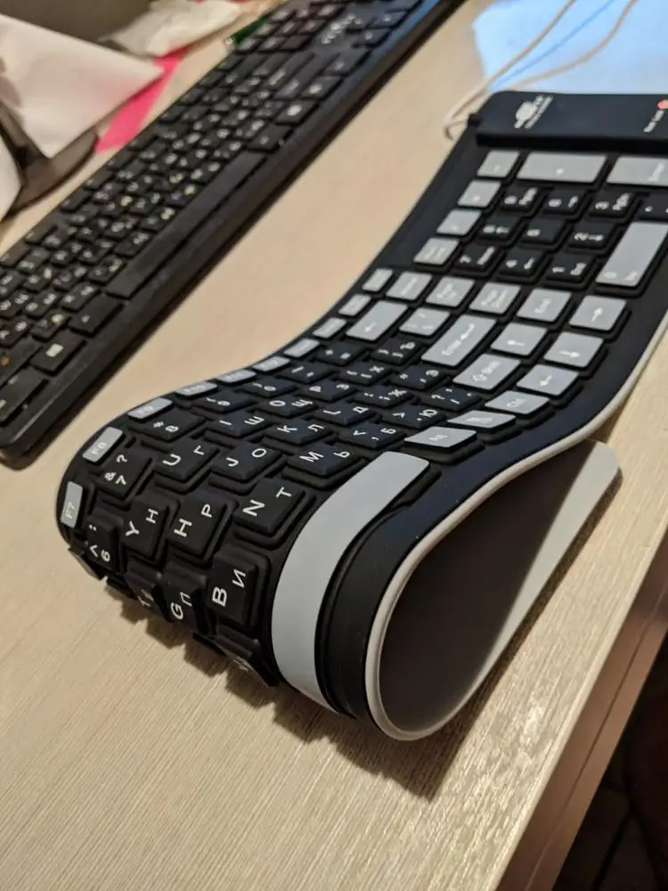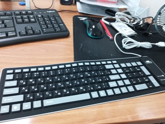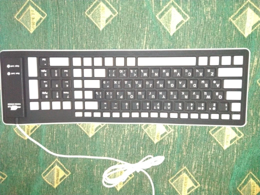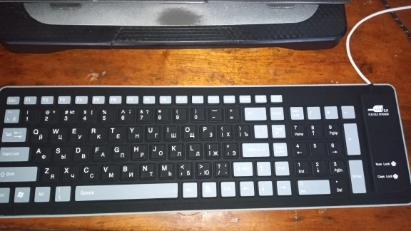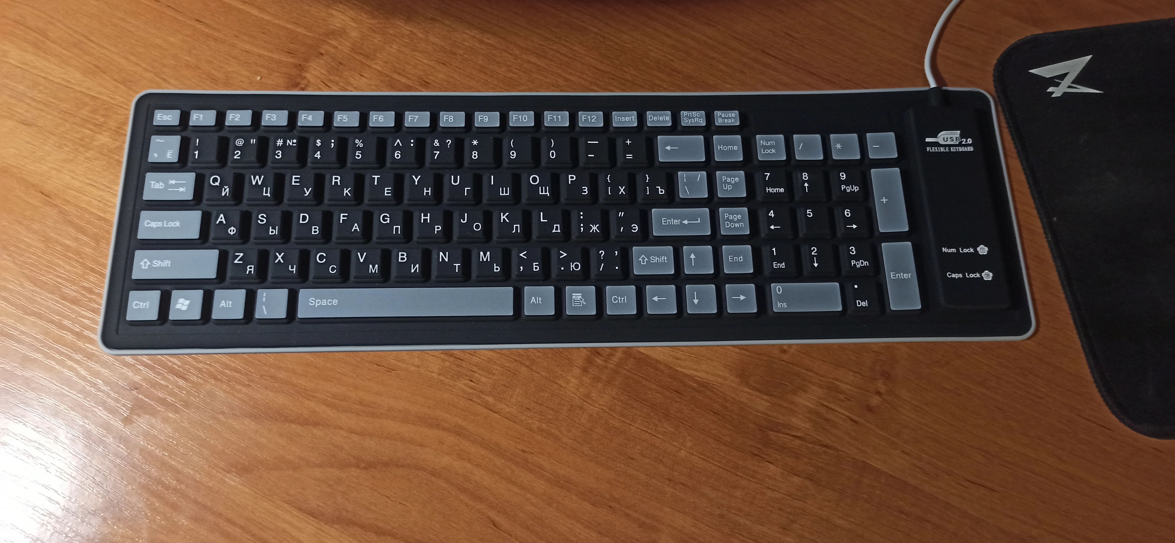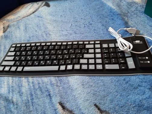 Клавиатура реально гибкая, силиконовые клавиши, водостойкая. При подключении всё работает, просто сначала нужно дать ей немного полежать и распрямиться. Расположение клавиш и их размер немного непривычен, поменьше. Нажатия на клавиши требуют несколько больше усилий. Для тихой работы - эта клавиатура подходит, но потребуется приноровиться. А вот для игр - очень сложно с ней, не совсем подходит.