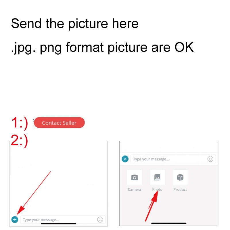 Как отправить текст/логотипы/изображения продавцу?1) Нажмите «связаться с продавцом»2) Нажмите «Знак Плюс», добавьте изображение формата jpg или png. (Лучше отправить оригинальное изображение, а не скриншот. Качество изображения на скриншоте слишком низкое)