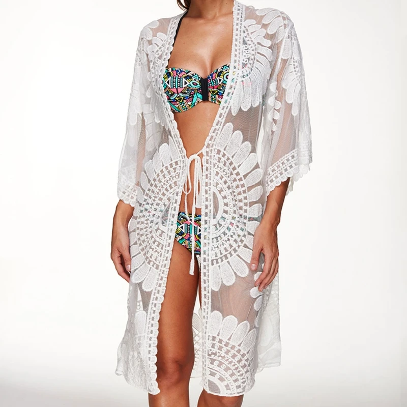 Пляжная накидка с цветочной вышивкой бикини купальник женский халат кардиган купальник черный белый бежевый цвет