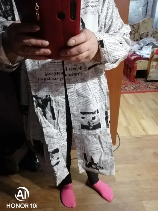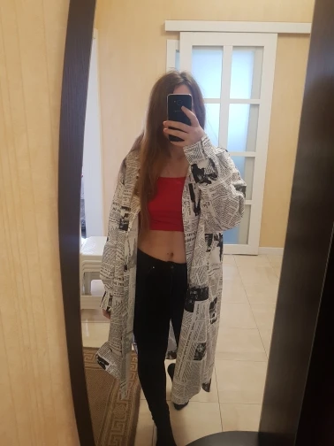 Отличное платье- рубашка. Размеры точно как в описании у продавца. Разница в длине переда и спинки - 7см. Принт смотрится прикольно, читать - не перечитать. Нет бирки с составом и логотипом производителя. Сшито качественно и аккуратно. К покупке рекомендую. На 96- 78-104 - ну очень оверсайз. От момента заказа до получения посылки с товаром в Ростовской области - 10 дней. Спасибо продавцу за оперативность м качественный товар.
