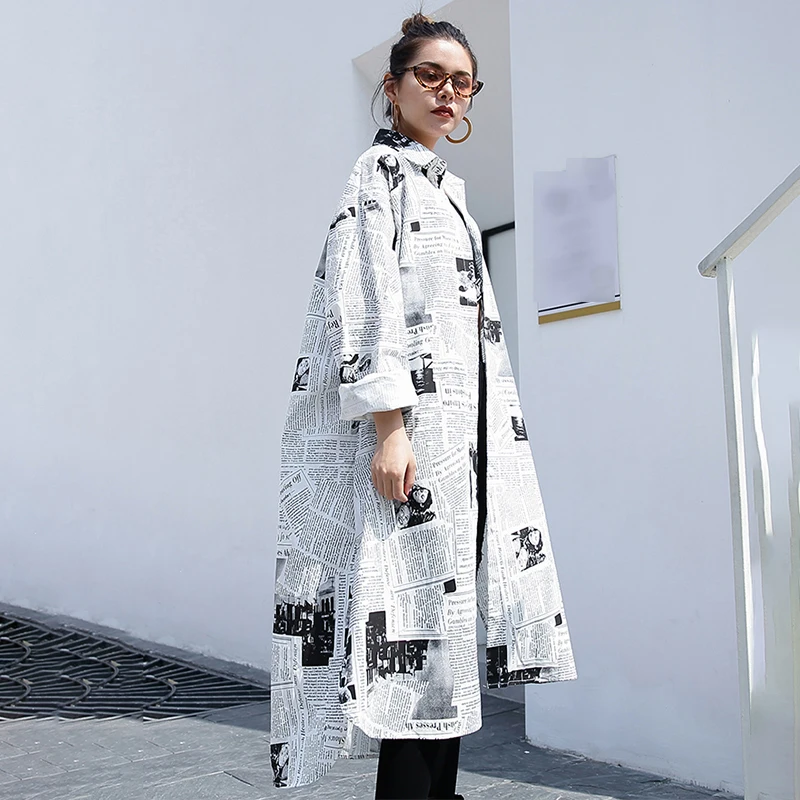 EAM 2022new Весна Осень лацкан с длинным рукавом белый печатный свободный нерегулярный большой размер длинная рубашка Женская блузка Мода JF008