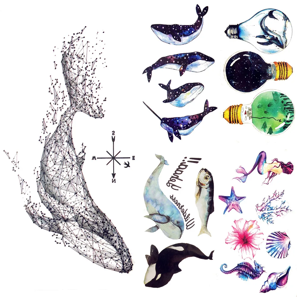 Милые геометрические наклейки для татуировки с Китом, Переводные татуировки с дельфином на воде, рыба, водитель для океана, для женщин, лица, временные татуировки для мужчин, боди-арт