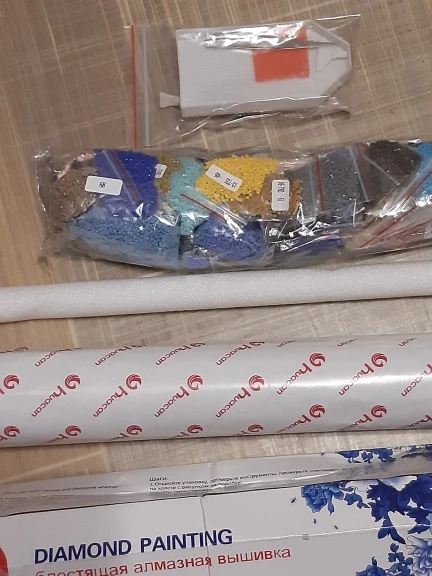 получила эту картину и ещё три в одной посылке,чему и рада,единственная эта картина была накручена на мягкий валик и соответственно она не помята на изгибах, как другие три картины.заказ шёл меньше месяца,спасибо продавцу,который картины накручивает на валик и алмазики находятся в зип пакетиках