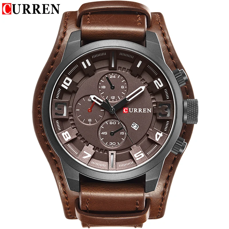 Часы наручные CURREN Мужские кварцевые, брендовые модные армейские спортивные в стиле милитари, с кожаным ремешком, с датой