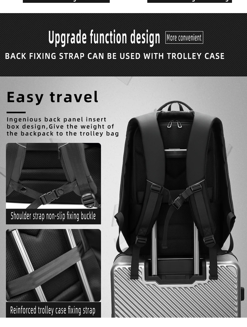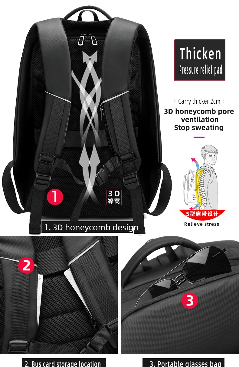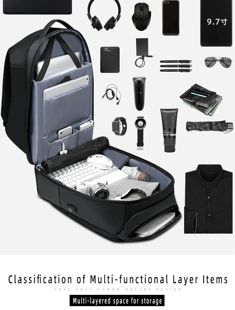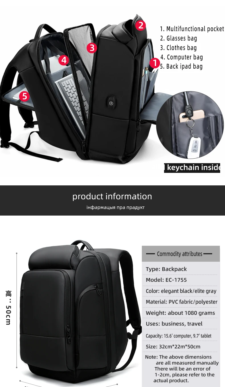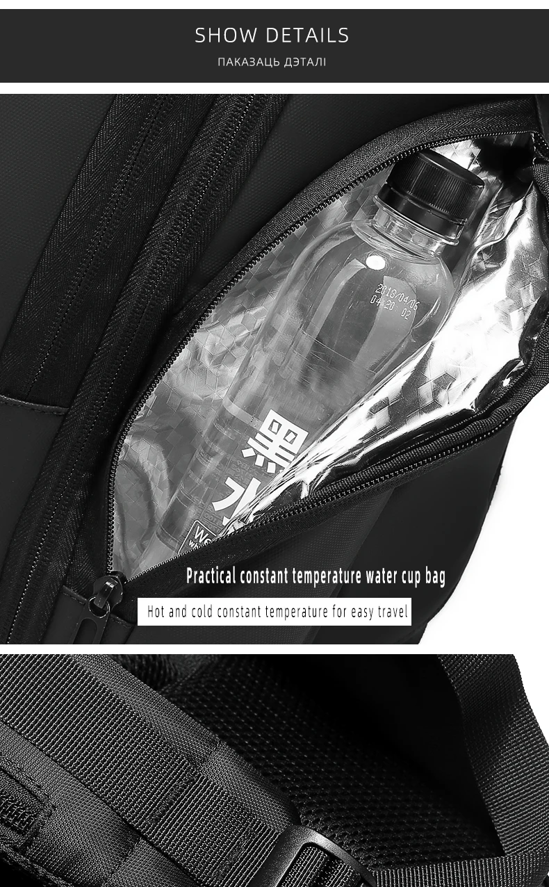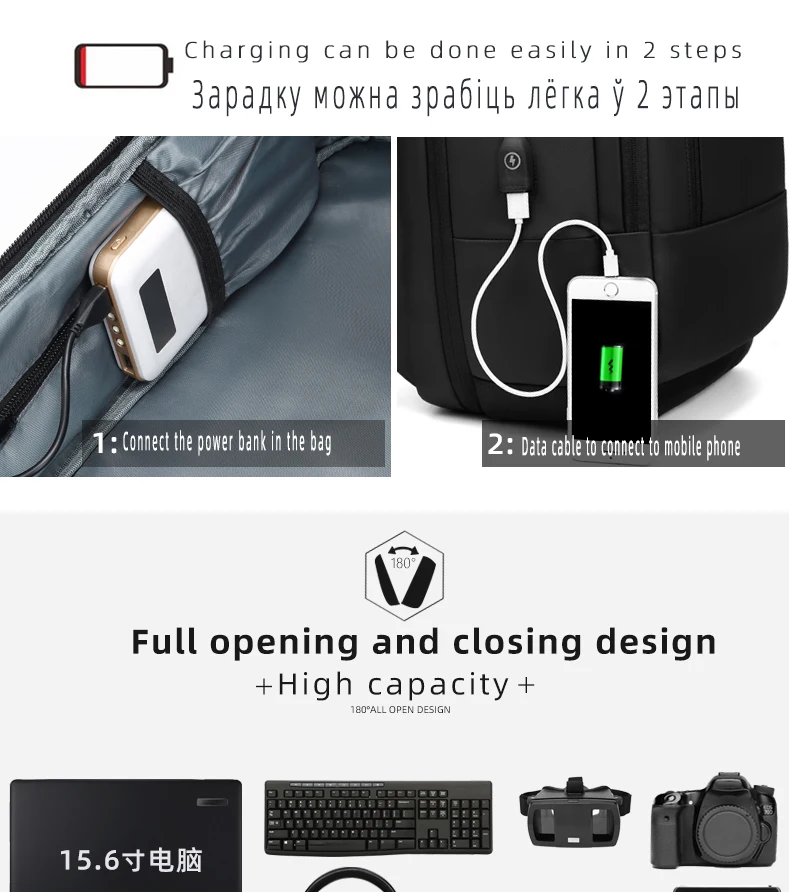 Рюкзак отличный, больше, чем я думал, удобный, водонепроницаемый и очень практичный. Я рекомендую продавцу, он очень отзывчив. Посылка прибыла через 3 недели во Францию. Рюкзак имеет 6 основных карманов: -Большой с разделением посередине и множеством карманов для легкого доступа внутри. -Противоугонная, на спине. -Передняя часть с держателем для ключей и несколькими приборами. -Топ. -Спереди один, самый маленький, для маленьких функций. -Боковая часть является теплоизоляционной, размер для бутылки (500 мл). Рюкзак также имеет два небольших кармана на плечевых ремнях. Есть только одна отрицательная точка: провод, указанный для функции зарядки, не отстегивается.