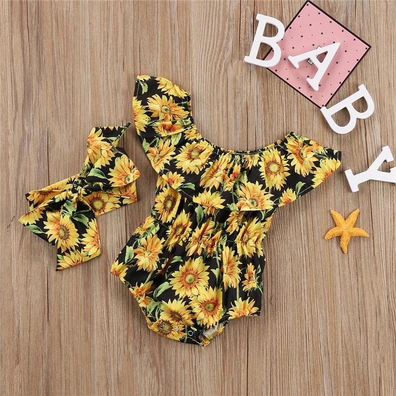 Боди pudcoco для новорожденных девочек с цветочным принтом, боди с хризантемой для маленьких девочек, солнечный комбинезон, повязка на голову, боди, наряды, одежда