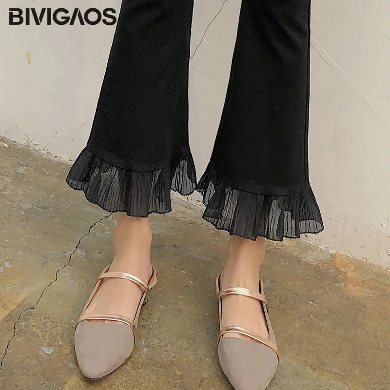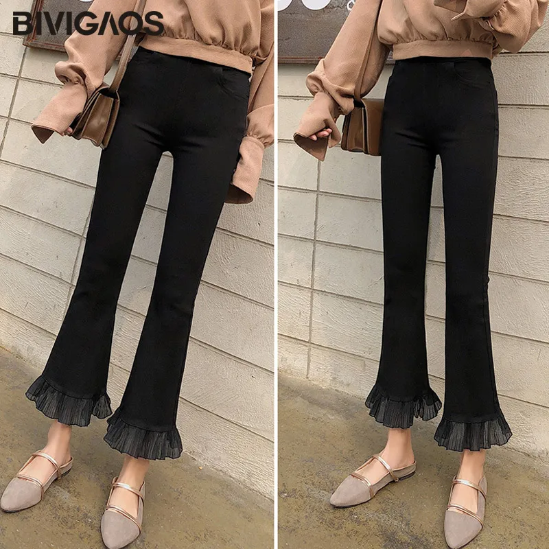 BIVIGAOS Весенние Новые Мода шифоновые кружевные расклешенные брюки женские узкие черные леггинсы эластичные Повседневные Брюки расклешенные брюки женские